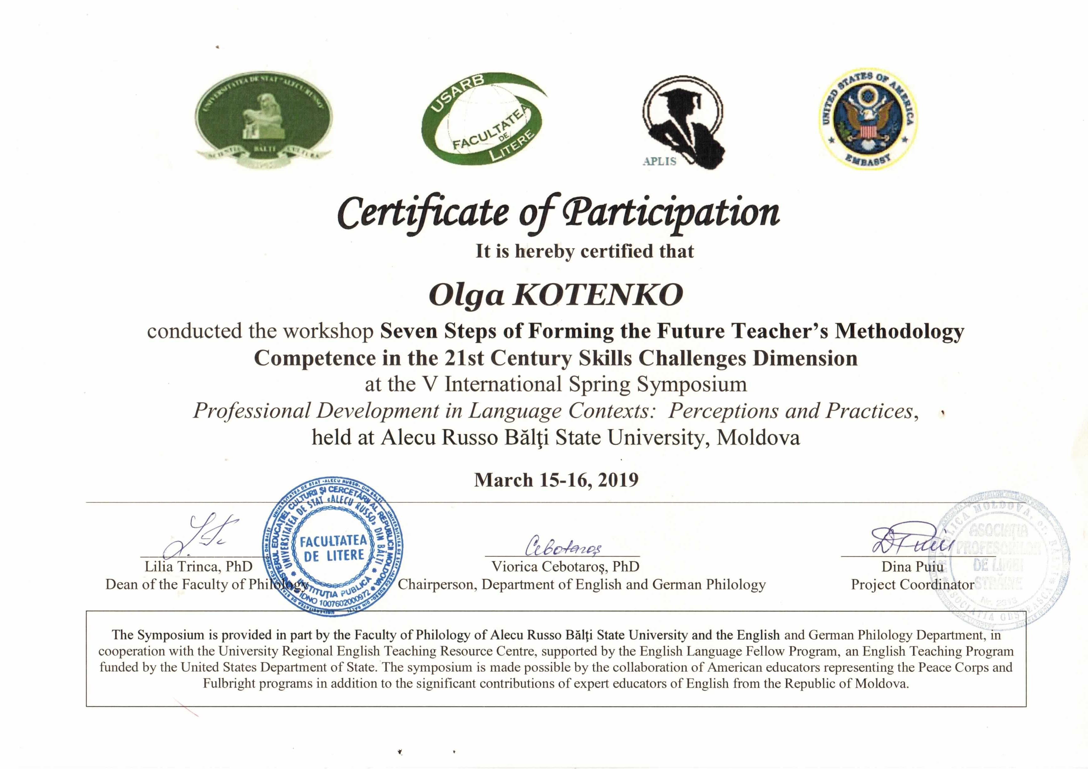 | 4029 | V International Spring Symposium Professional Development in Language Contexts: Perceptions and Practices | Seven Steps of Forming the Future Teacher’s Methodology Competence in the 21st Century Skills Challenges Dimension | Bălți, Moldova |