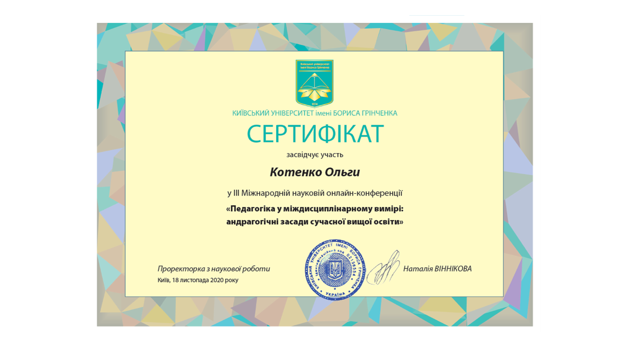 | 5829 | ІІI Міжнародна наукова онлайн-конференція «Педагогіка у міждисциплінарному вимірі: андрагогічні засади сучасної вищої освіти» | Міждисциплінарна інтеграція як чинник забезпечення якості професійної підготовки сучасного педагога: Європейські практики; досвід Київського університету імен Бориса Грінченка | Київський університет імені Бориса Грінченка |