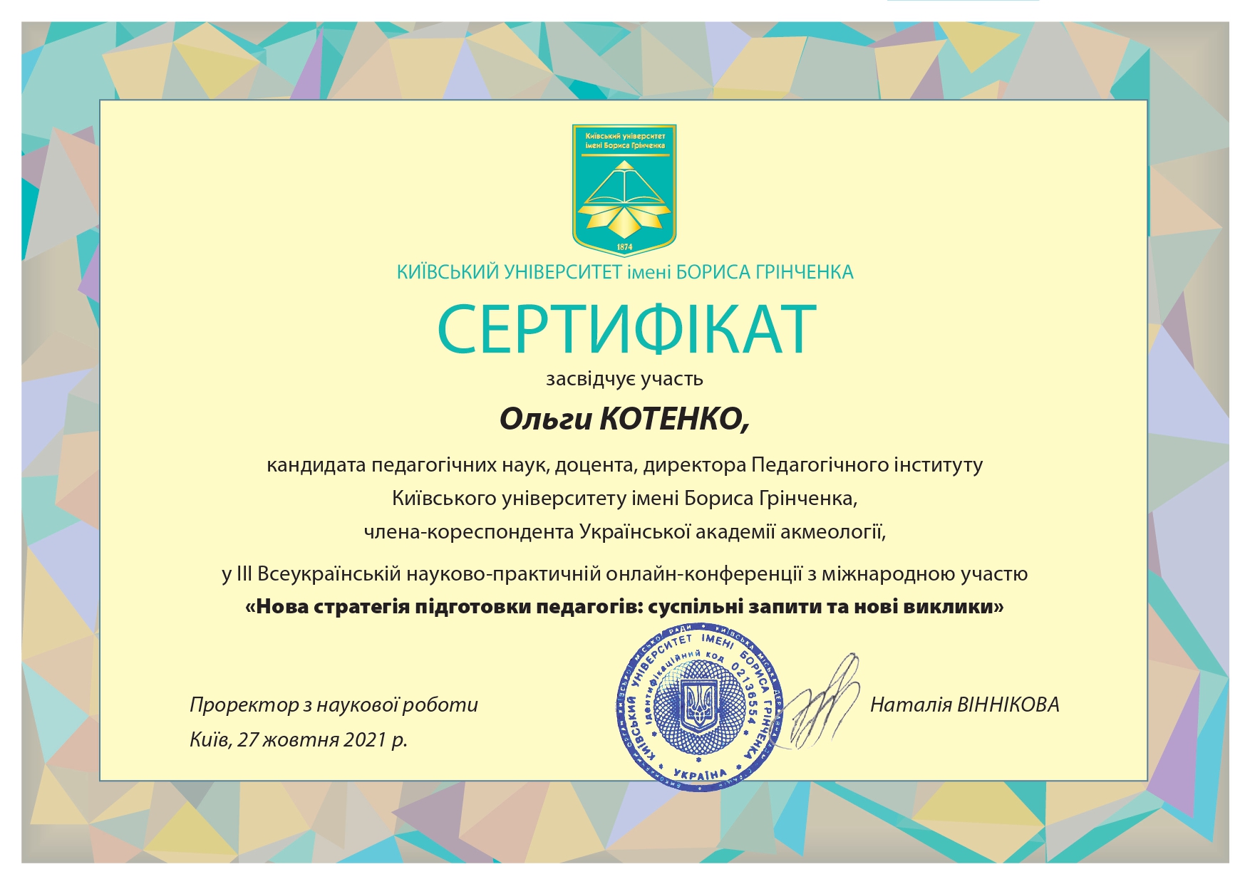 | 7184 | ІІІ Всеукраїнська науково-практична онлайн-конференція з міжнародною участю «Нова стратегія підготовки педагогів: суспільні запити та нові виклики» | Реалізація нової стратегії підготовки сучасного педагога: досвід Педагогічного інституту Київського університету імені Бориса Грінченка | Київський університет імені Бориса Грінченка |