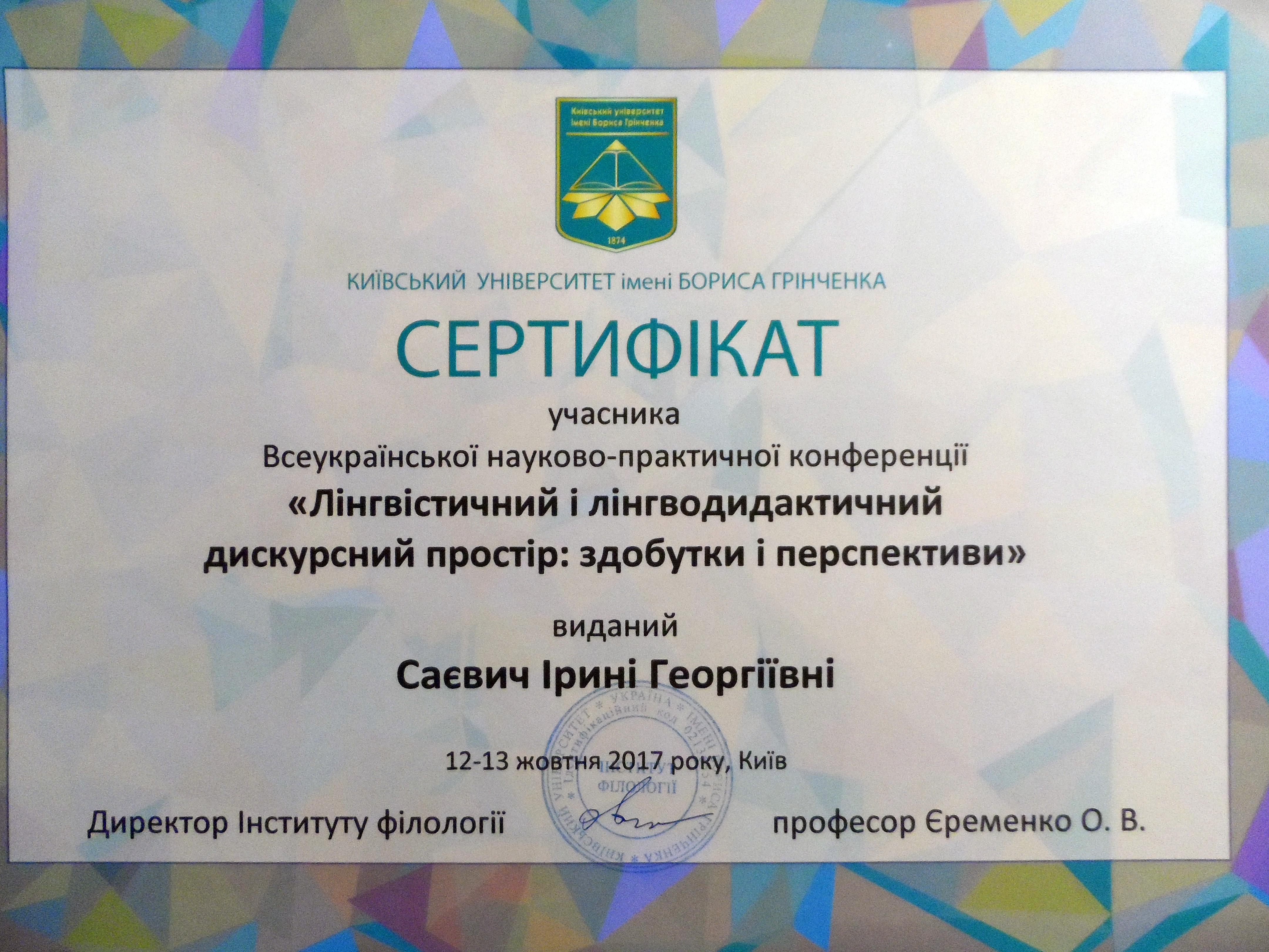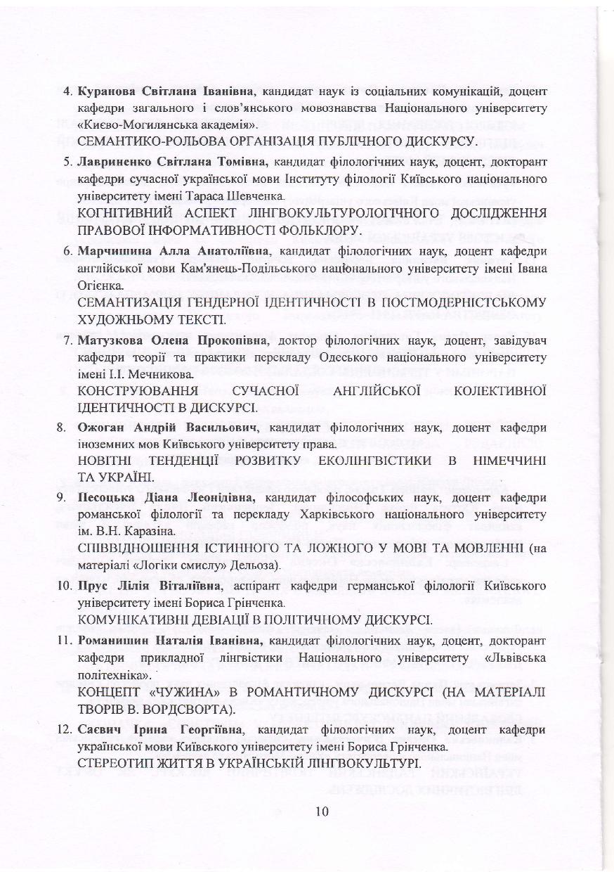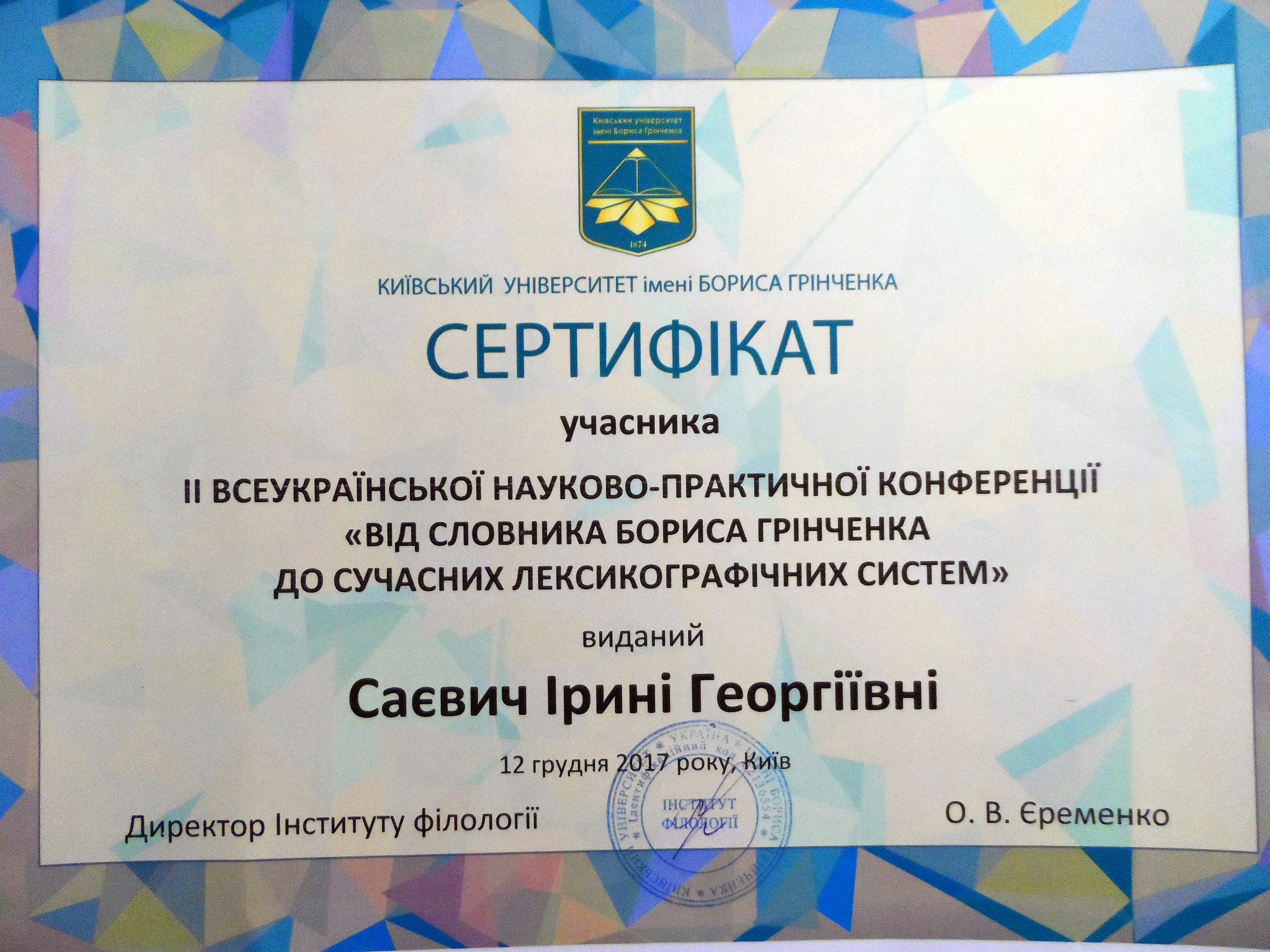 | 2944 | Всеукраїнська науково-практична конференція "Лінгвістичний і лінгводидактичний дискурсний простір: здобутки і перспективи" | Узуальне / неузуальне в лінгвосеміозисі існування (на матеріалі слов'янських мов) | Київ, КУБГ |