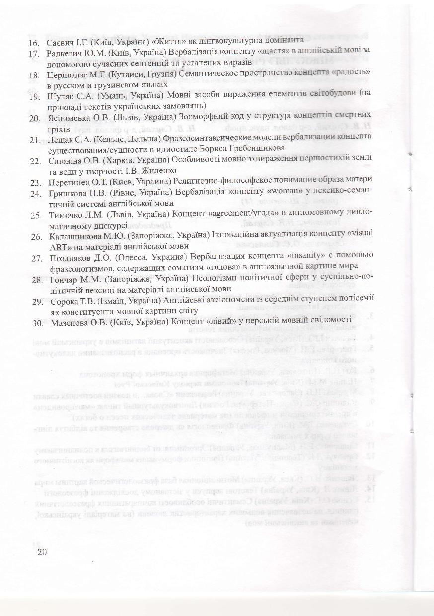 | 679 | ІІ Міжнародна наукова конференція «Мова: класичне – модерне - постмодерне». 9.10.2015 р. | Стереотип життя в українській лінгвокультурі | Київ, Національний університет «Києво-Могилянська академія» |