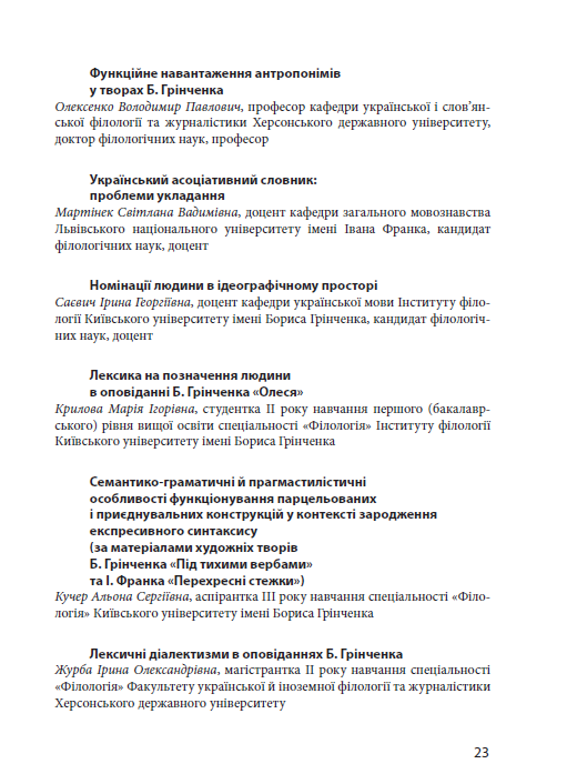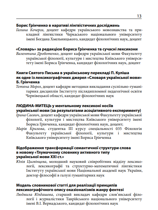 | 7697 | Всеукраїнська наукова онлайн-конференція "Український світ Бориса Грінченка": XІV Грінченківські читання | Номінації людини в ідеографічному просторі | м. Київ, Київський університет імені Бориса Грінченка |