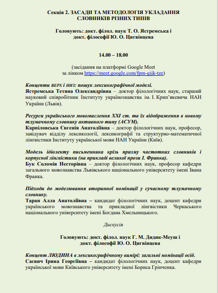 | 8405 | Міжнародна наукова конференція "Лексикографічна парадигма ХХІ ст.: До 100-ліття від дня народження доктора філологічних наук, професора Леоніда Сидоровича Паламарчука | Концепт ЛЮДИНА в лексикографічному вимірі: загальні номінації осіб | Інститут української мови НАН України |