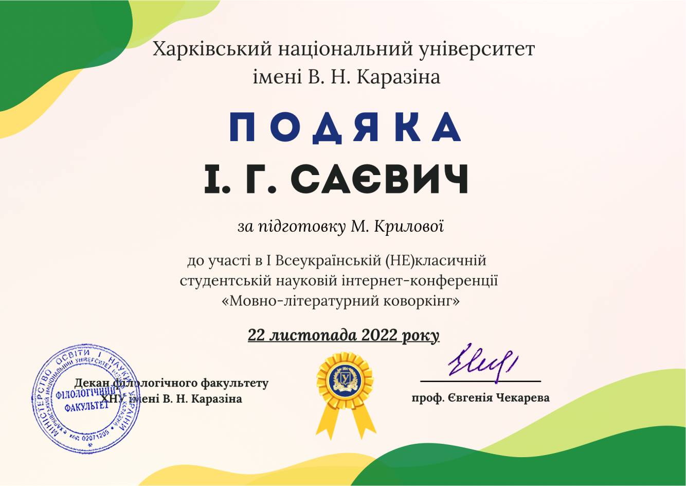 | 292 | Крилова Марія Ігорівна | Кафедра української мови | I | IV Всеукраїнський конкурс фото та відеоробіт «LIME. Go to read!» | Київ | 2022 | Всеукраїнський | III | Крилова Марія.pdf |