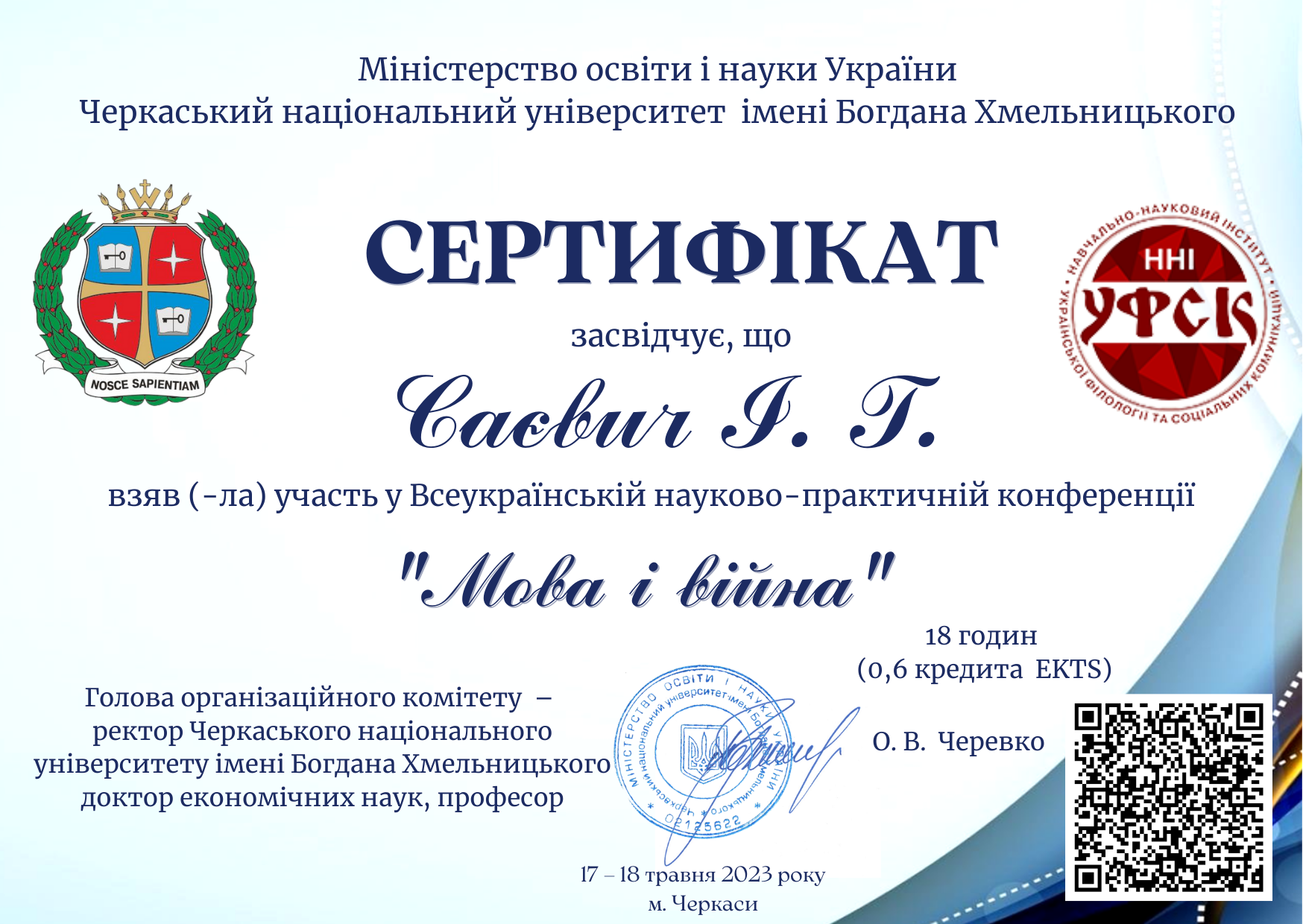 | 9275 | Всеукраїнська науково-практична конференція "Мова і війна" | Асоціативний потенціал концептів ЖИТТЯ і СМЕРТЬ в українській лінгвокультурі | м. Черкаси, Черкаський національний університет імені Богдана Хмельницького |
