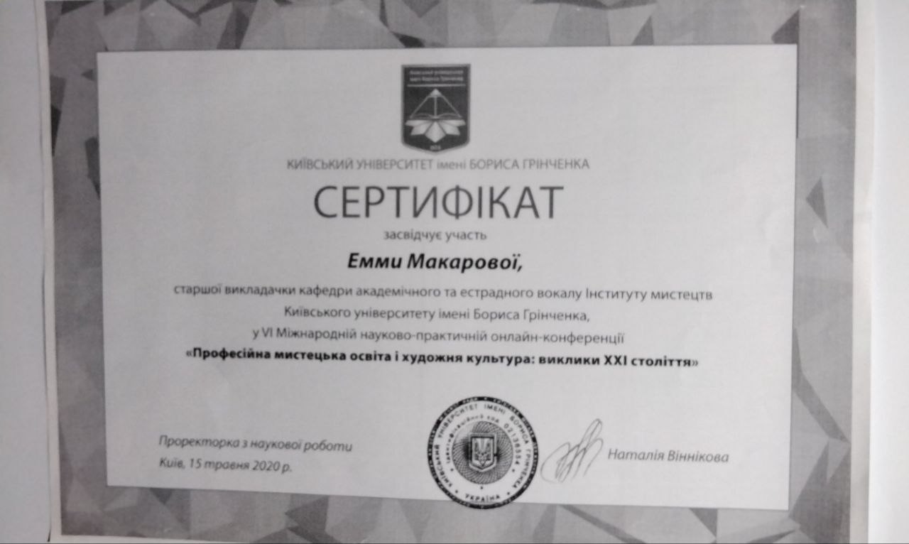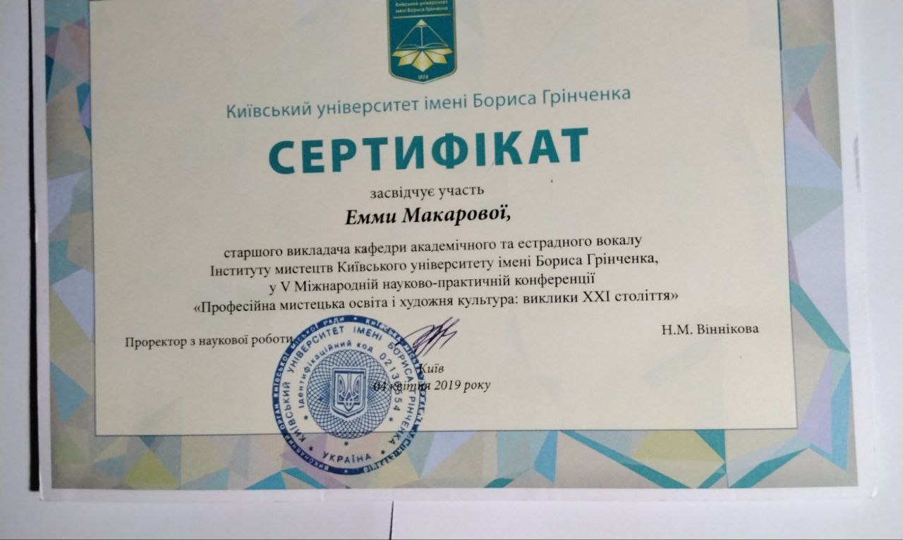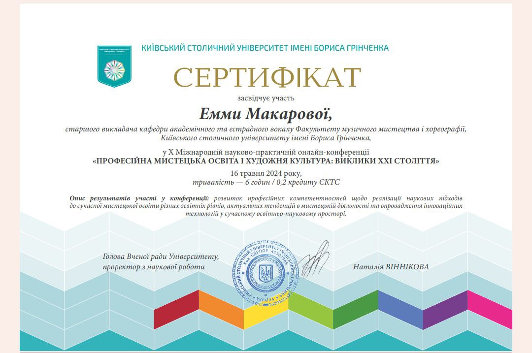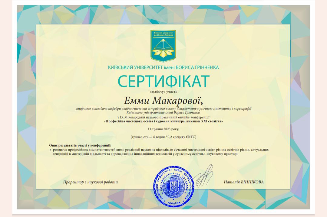 | 308 | Факультет музичного мистецтва і хореографії | Кафедра академічного та естрадного вокалу | Педагог-репетитор (підготовка з виконавцем партії) | Вручення дипломів випускникам Університету Грінченка | Україна, Київ | 2023 |