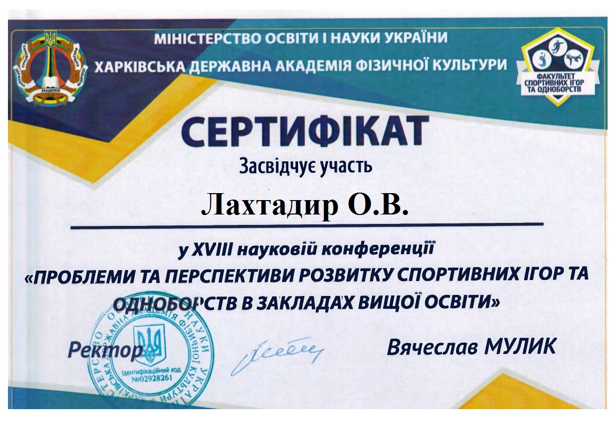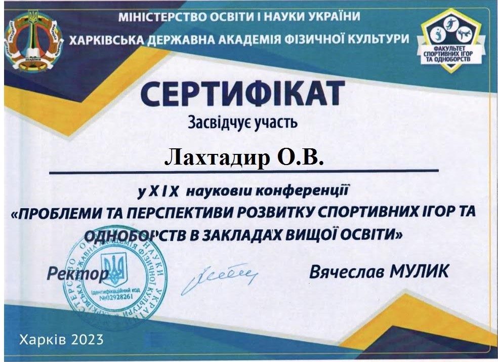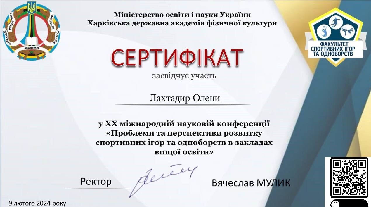 | 12448 | XX Міжнародна наукова конференція "Проблеми та перспективи розвитку спортивних ігор та одноборств в закладах вищої освіти" | Психологічна готовність єдиноборців до змагань | Харків |