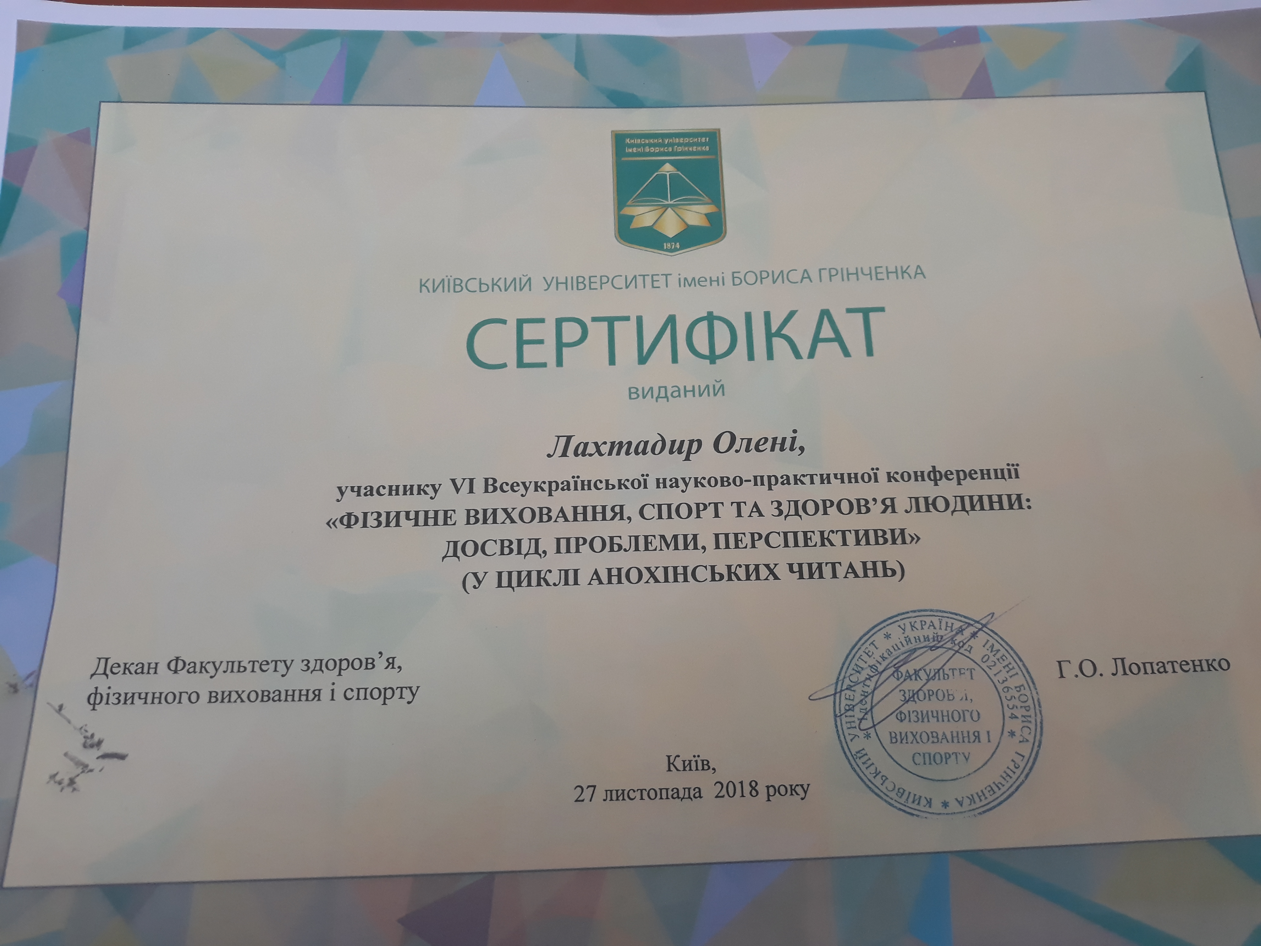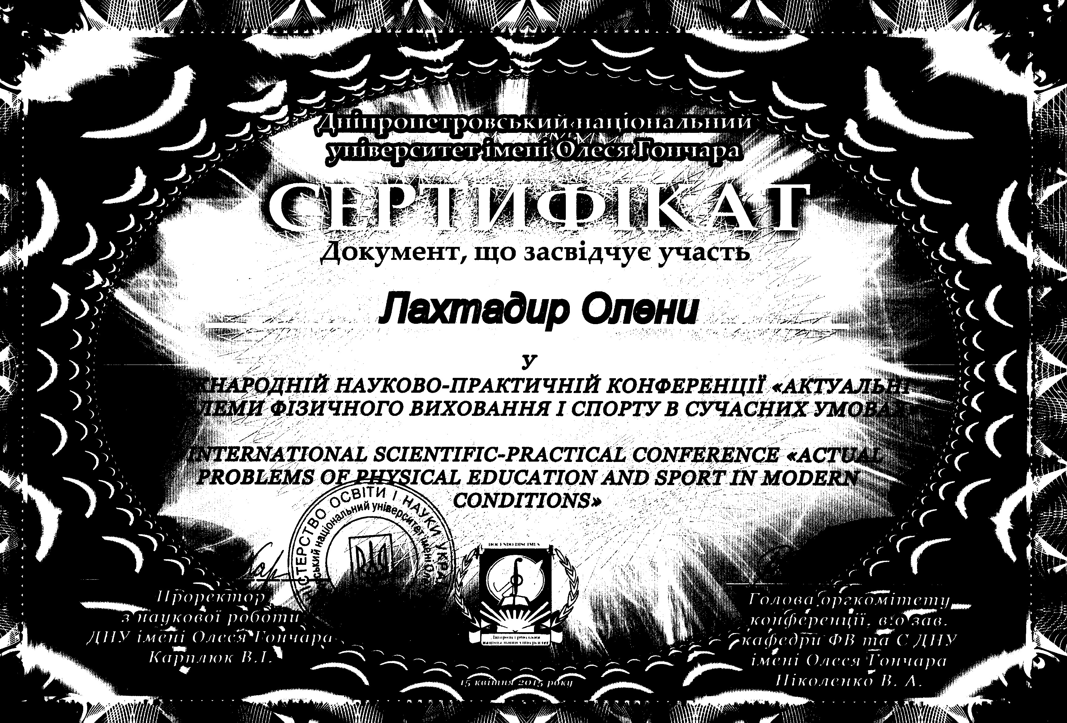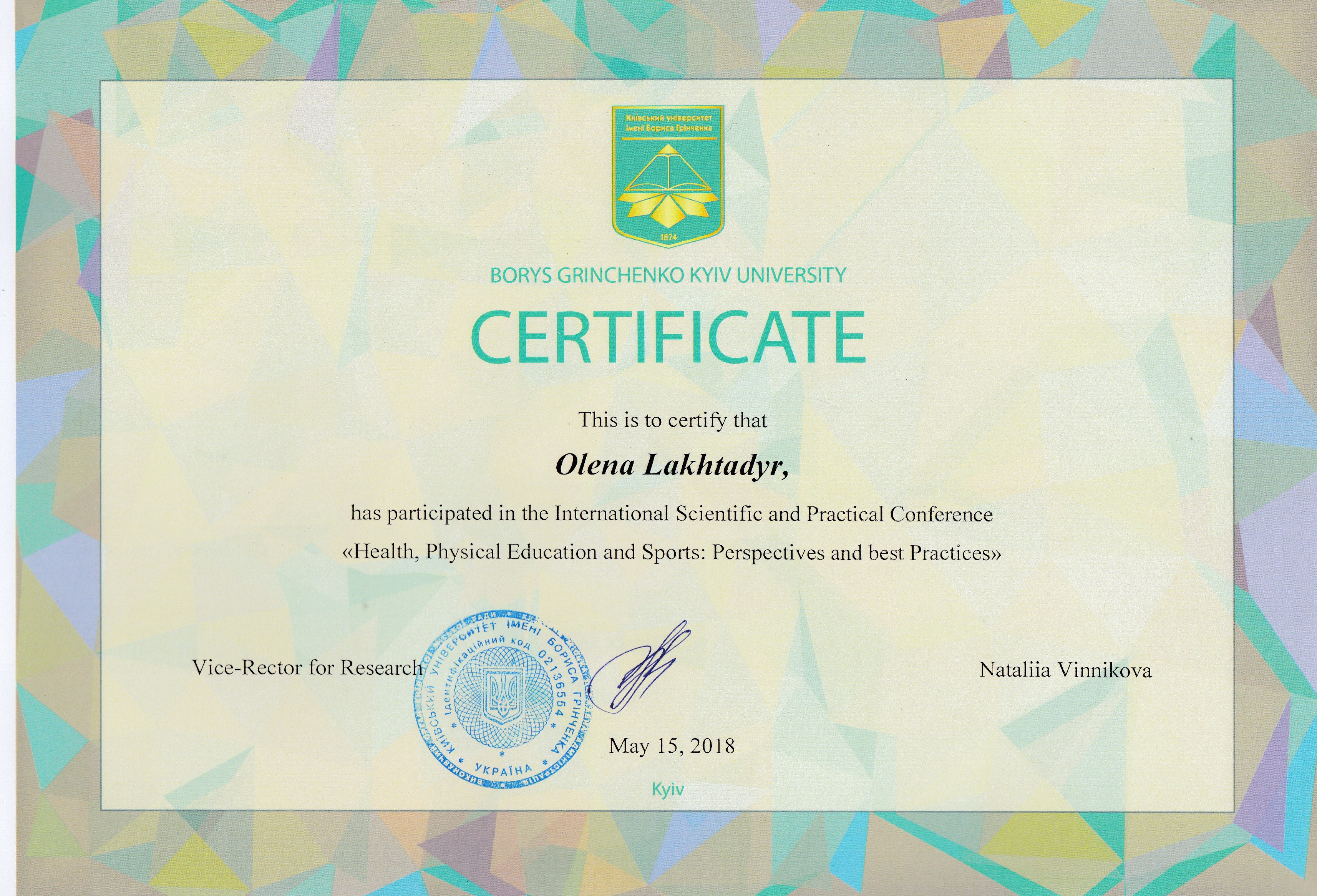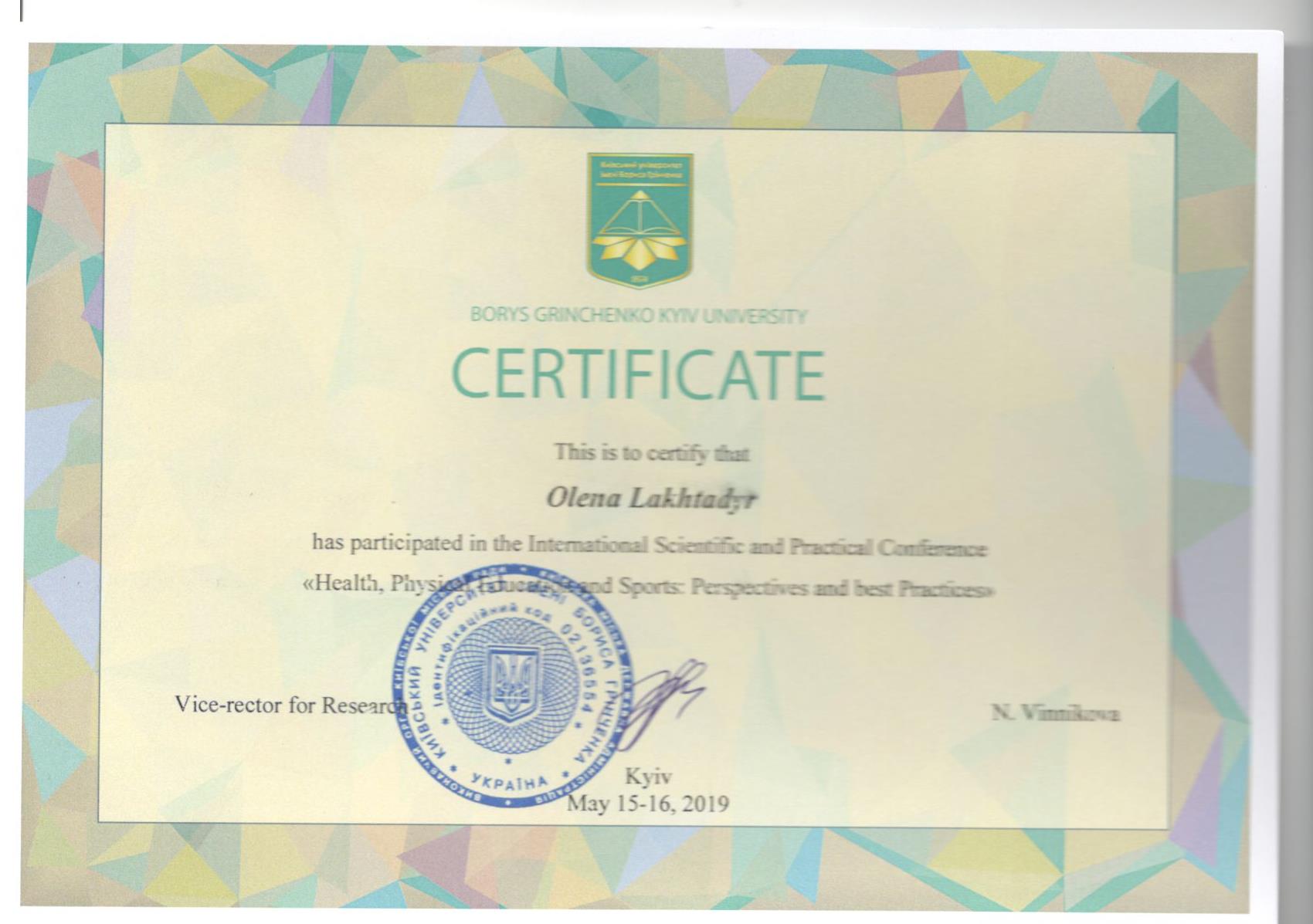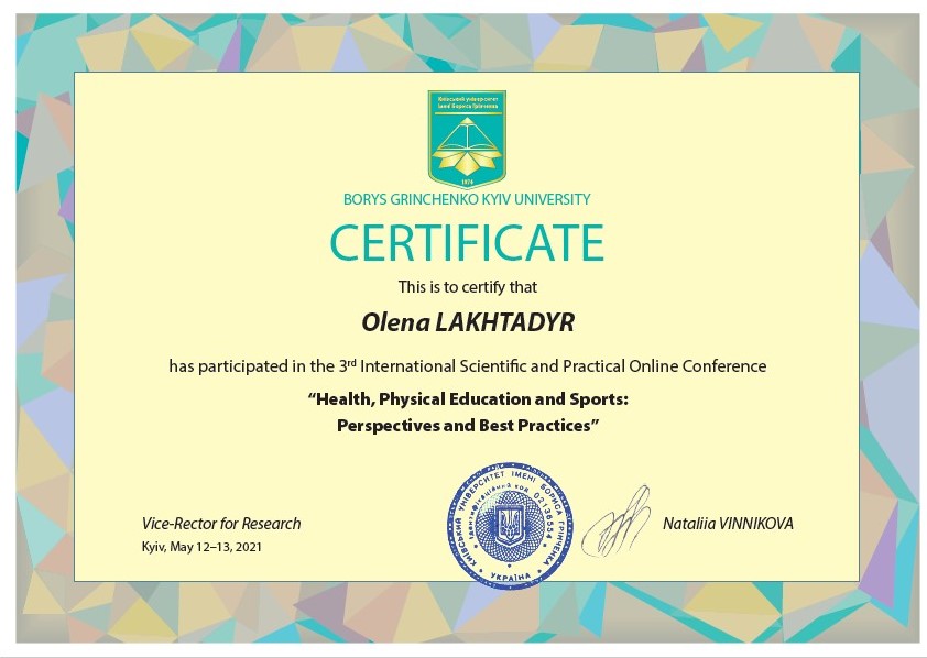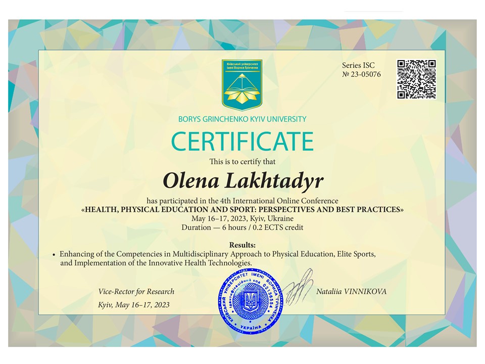 | 4242 | Mіжнародна науково-практична конференція з питань здоров'я, фізичного виховання та спортивних перспектив та найкращих практик | Комунікативна компетентність студентів | м. Київ |
