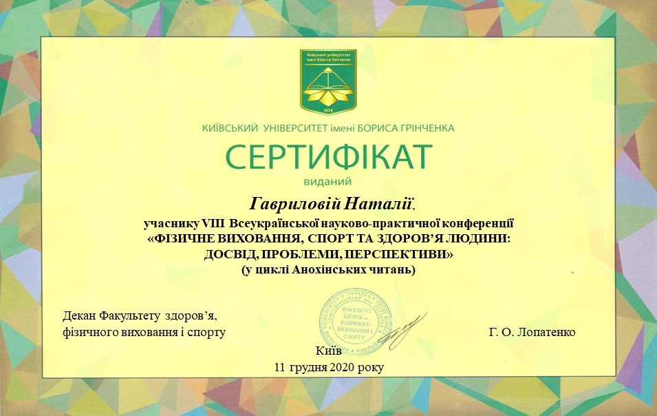 | 6860 | ІІІ Міжнародній науково-практичній онлайн-конференції «ЗДОРОВ’Я, ФІЗИЧНЕ ВИХОВАННЯ І СПОРТ: ПЕРСПЕКТИВИ ТА КРАЩІ ПРАКТИКИ | Самопізнання майбутніх тренерів з обраного виду спорту у процесі вивчення дисципліни :"Університетські студії" | м.Київ |