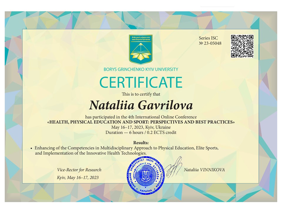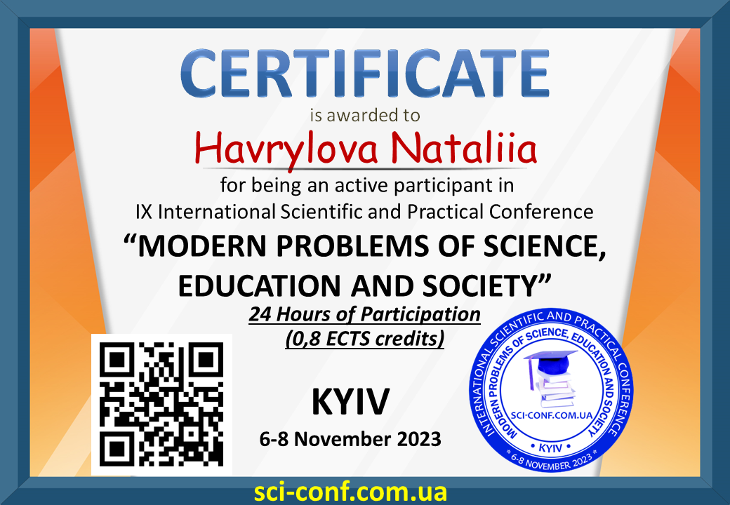 | 9687 | The 9th International scientific and practical conference “Modern problems of science, education and society” (November 6-8, 2023) SPC “Sciconf.com.ua”, Kyiv, Ukraine. 2023. C. 617-619. (публікація зі студентами) | Сучасний стан рухової активності студентів. | Київ |