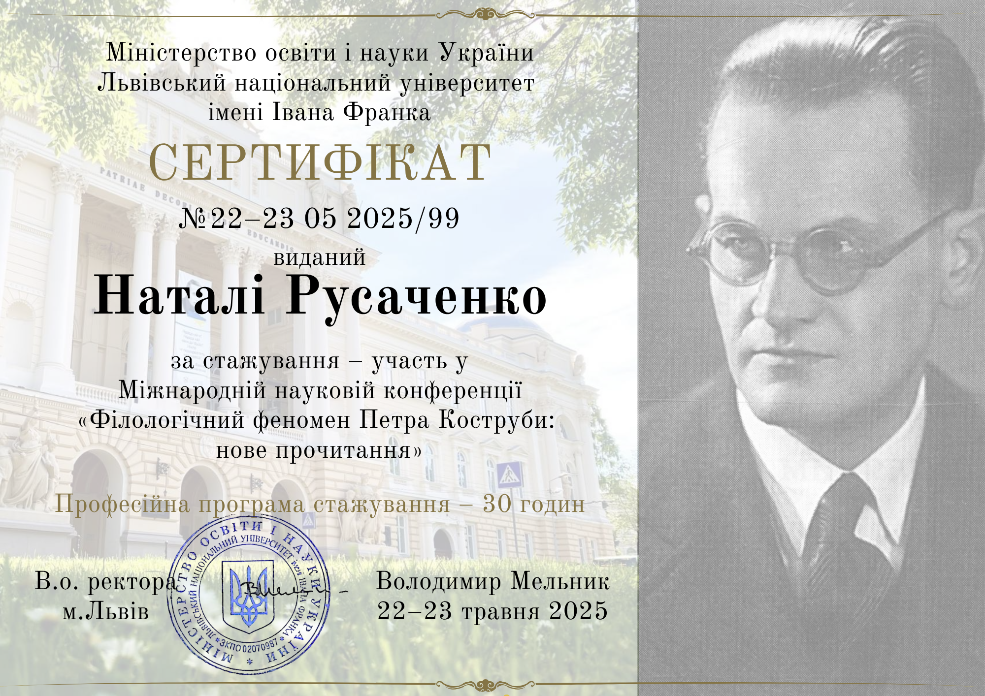 | 12063 | Міжнародна наукова конференція «Філологічний феномен Петра Коструби: нове прочитання» | Морфонологічні явища як засіб вираження граматичних значень в українській мові | м. Львів |