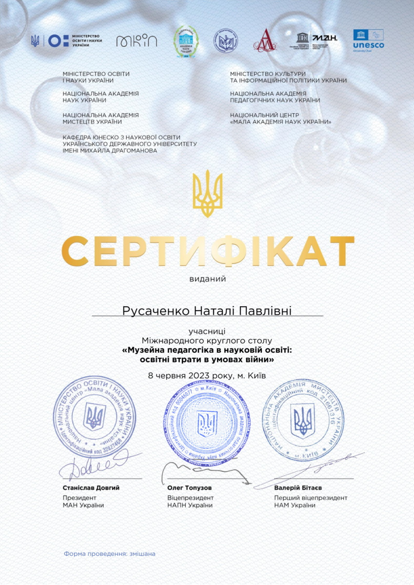 | 9564 | Міжнародний круглий стіл "Музейна педагогіка в науковій освіті: освітні втрати в умовах війни" | Діалектні матеріали як елемент віртуального етнографічного музею | Київ |