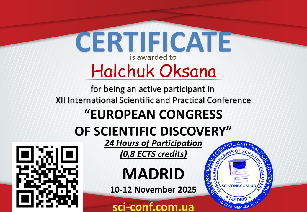 | 12370 | "European Congress of Scientific Discovery" | "Антропологічні аспекти поезії в античних художніх координатах" | Мадрид, Іспанія |