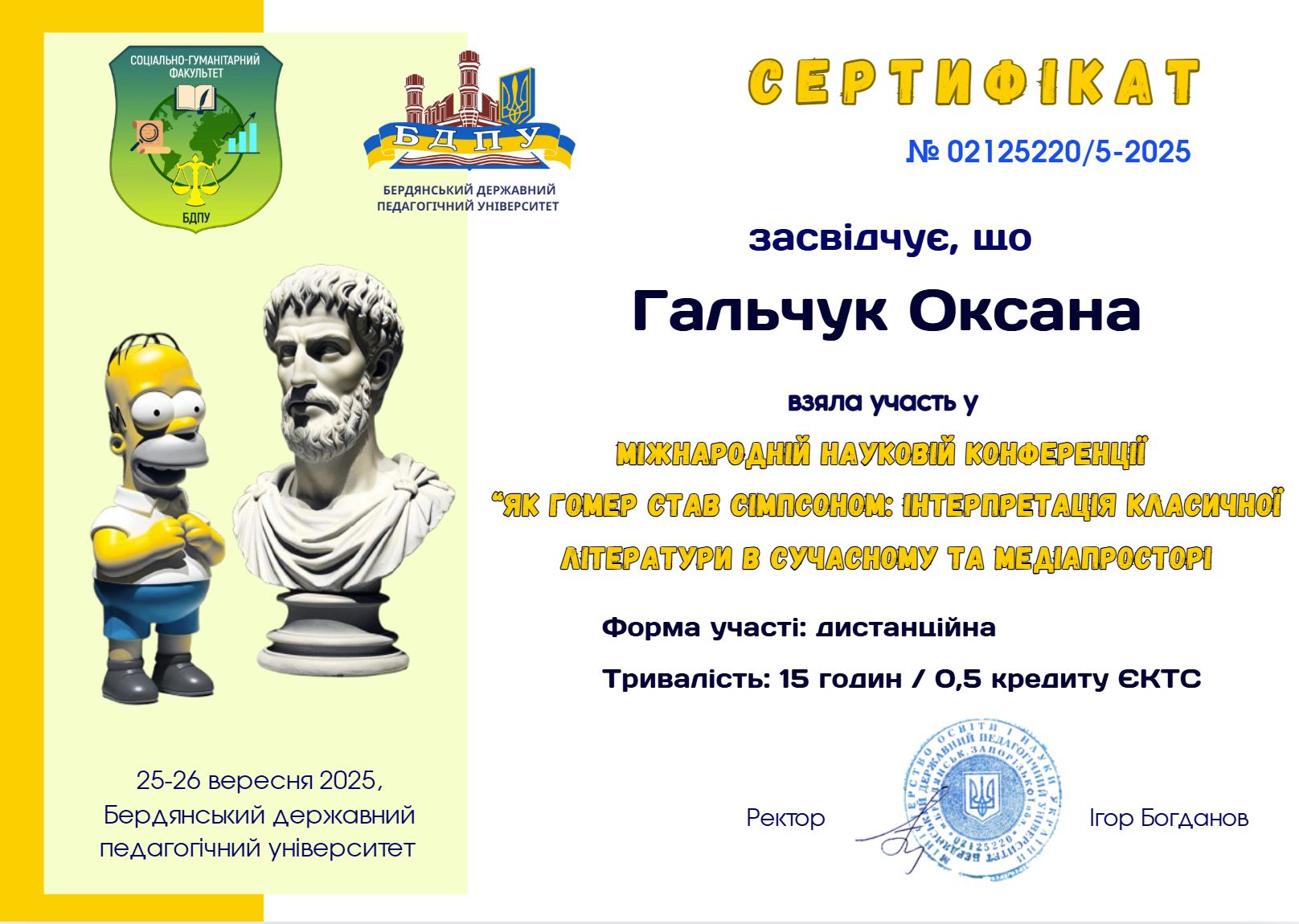 | 12377 | "Як Гомер став Сімпсоном: інтерпретація класичної літератури в сучасному літературному та медіапросторі" | "Горація Андрія Содомори: рецепція та інтерпретація" | Бердянськ-Запоріжжя |