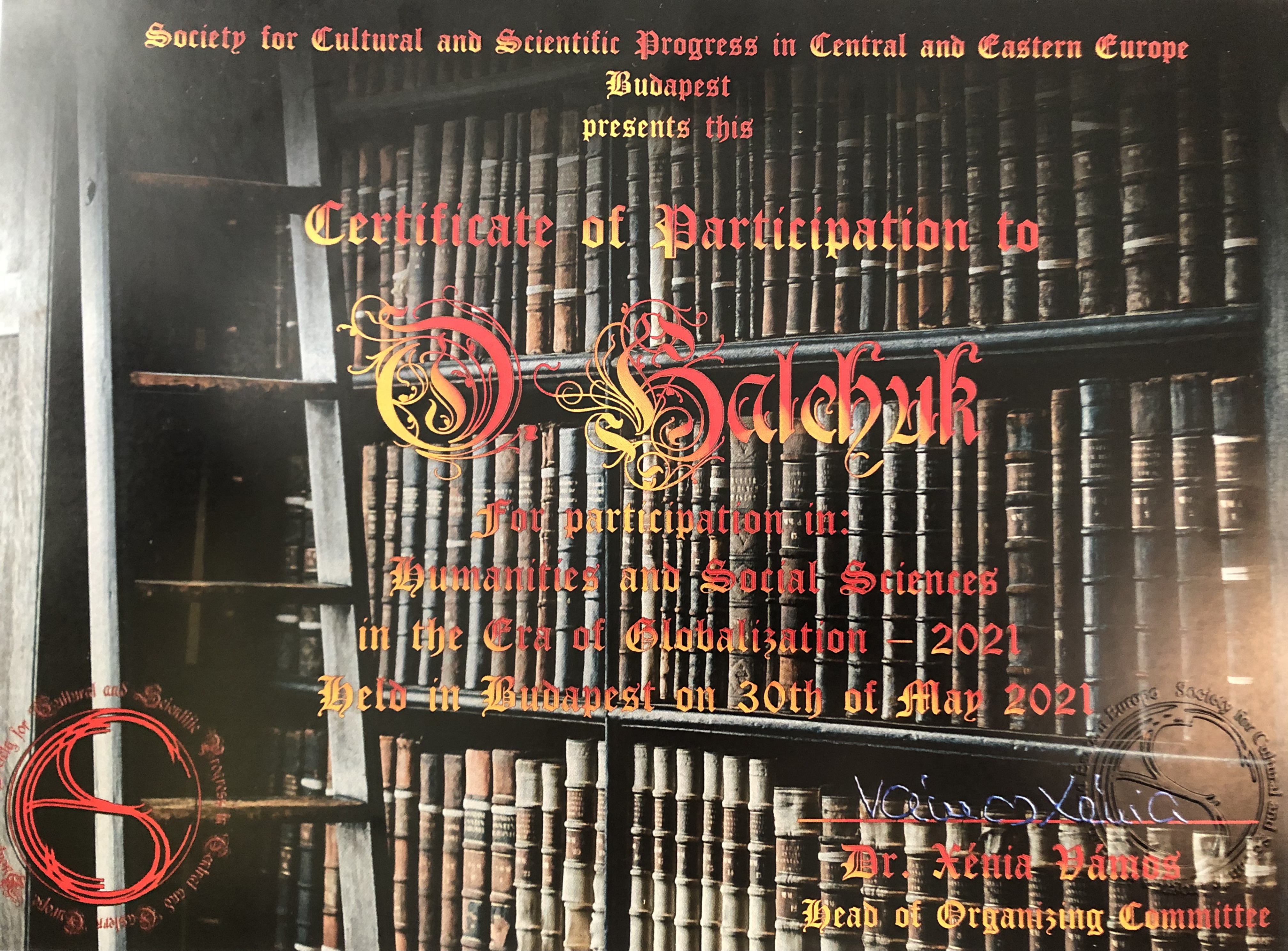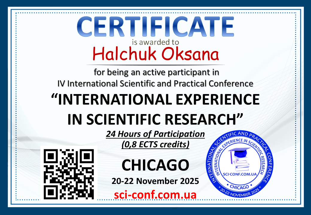 | 12470 | «International experience in Scientific Research» | The historical and cultural fin the siècle epoch in artistic personae: the poetic vision of Lina Kostenko | Чикаго, США |