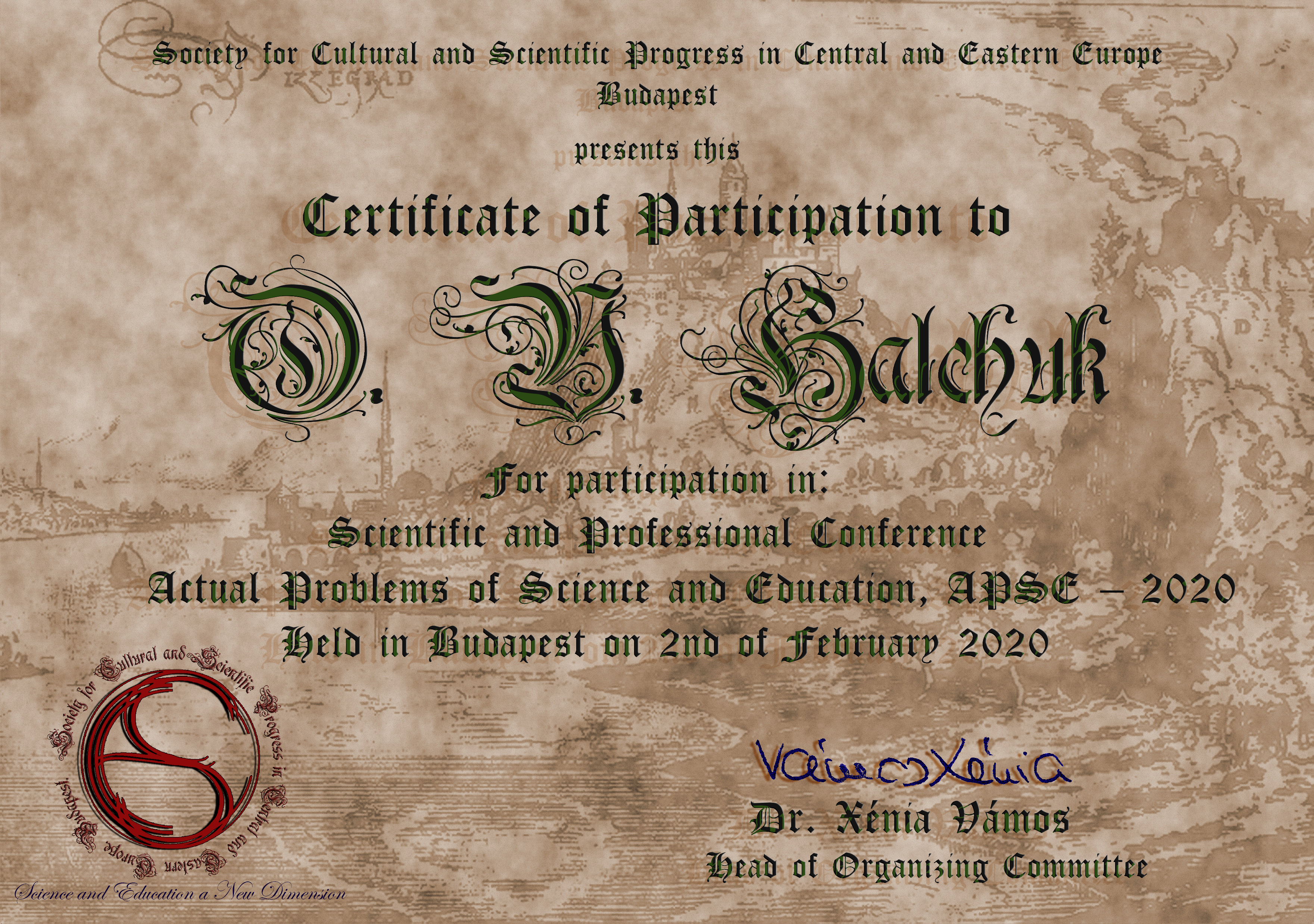 | 5217 | «Actual Problems of Science and Education» | «Кохання – смерть – краса» в подвійному кодуванні Джона Голсуорсі (на матеріалі новели «Цвіт яблуні») | Будапешт |