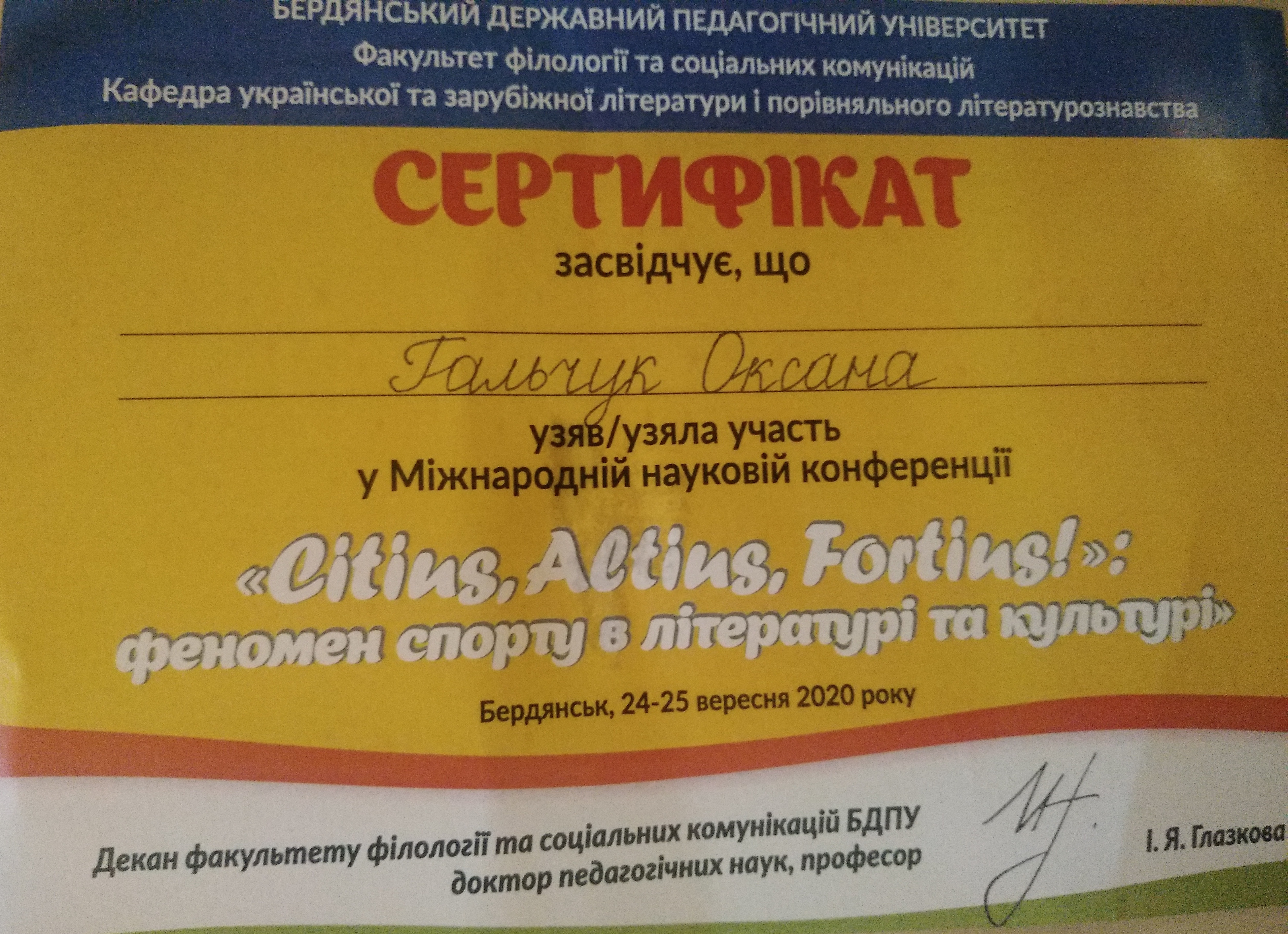 | 5714 | "Citins, Altins, Fortins!": феномен спорту в літературі та культурі" | Феномен Роккі як персонажа, міфологеми, ідеологеми | Бердянськ |