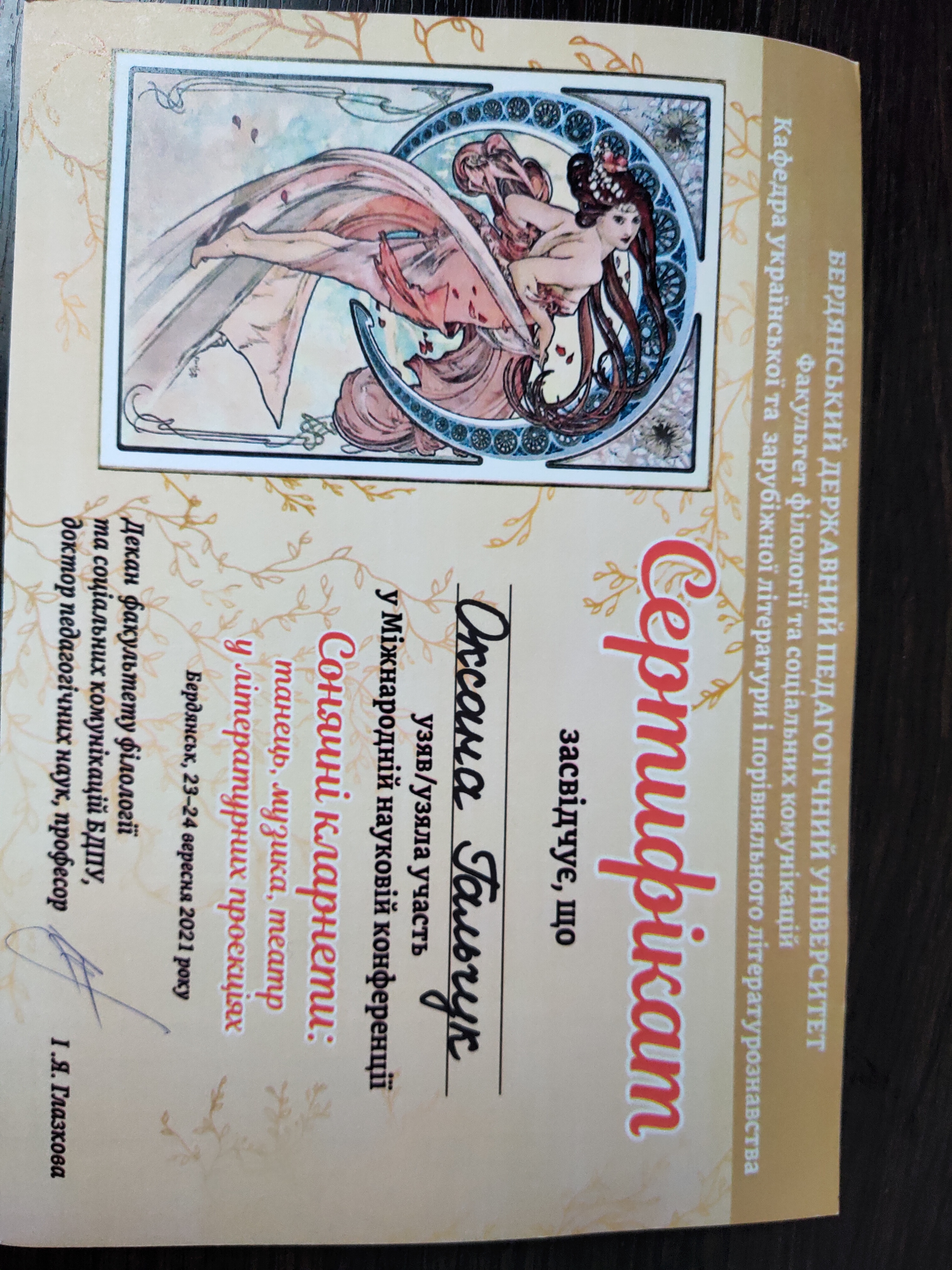 | 7206 | Сонячні кларнети: танець, музика, театр у літературних проекціях | Ерос і Танатос у топосі танцю: авторські моделі в літературі порубіжжя | Бердянськ |