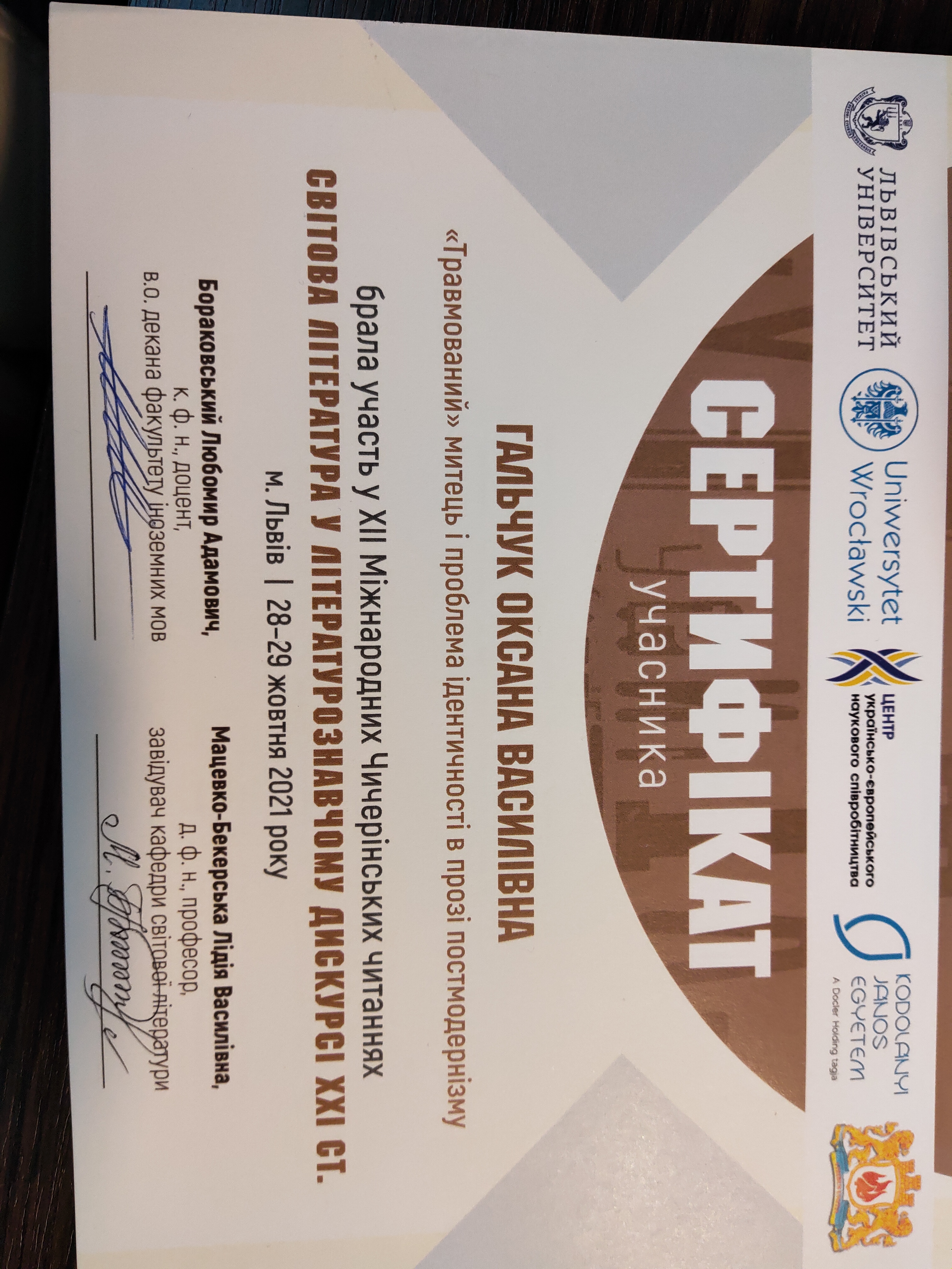 | 7291 | ХІІ Міжнародні Чичерінські читання | "Травмований митець" і проблема ідентичності в прозі постмодернізму | Львів |
