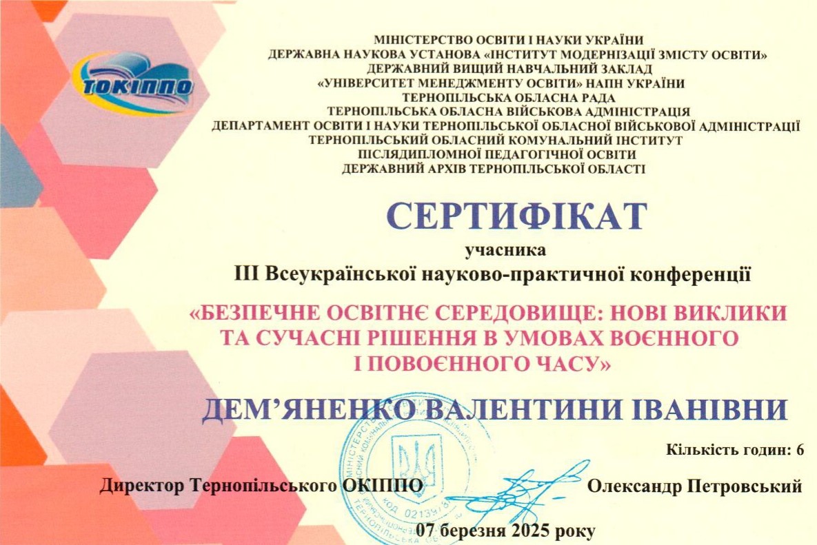 | 11661 | ІІІ Всеукраїнська науково-практична конференція “Безпечне освітнє середовище: нові виклики та сучасні рішення в умовах воєнного і повоєнного часу” | Підготовка майбутніх вихователів до організації безпечного освітнього середовища у закладі дошкільної освіти | Тернопіль |