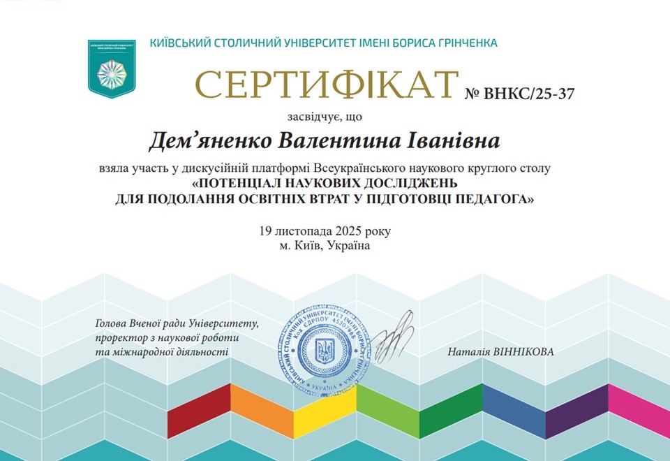 | 162 | Факультет педагогічної освіти | Кафедра освітології та психолого-педагогічних наук | 2.9 | 0 | 2025 | https://www.researchgate.net/profile/Valentina_Demianenko |