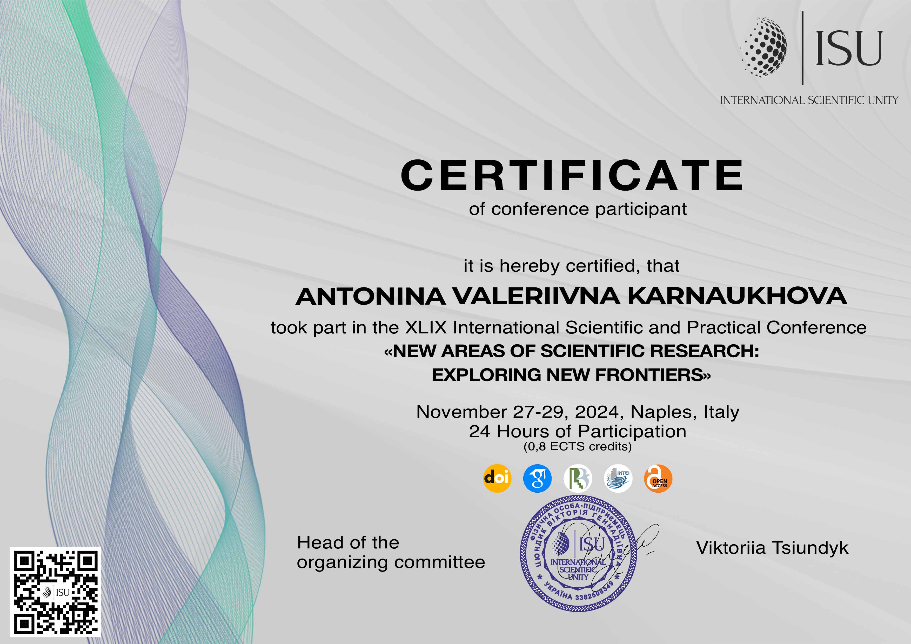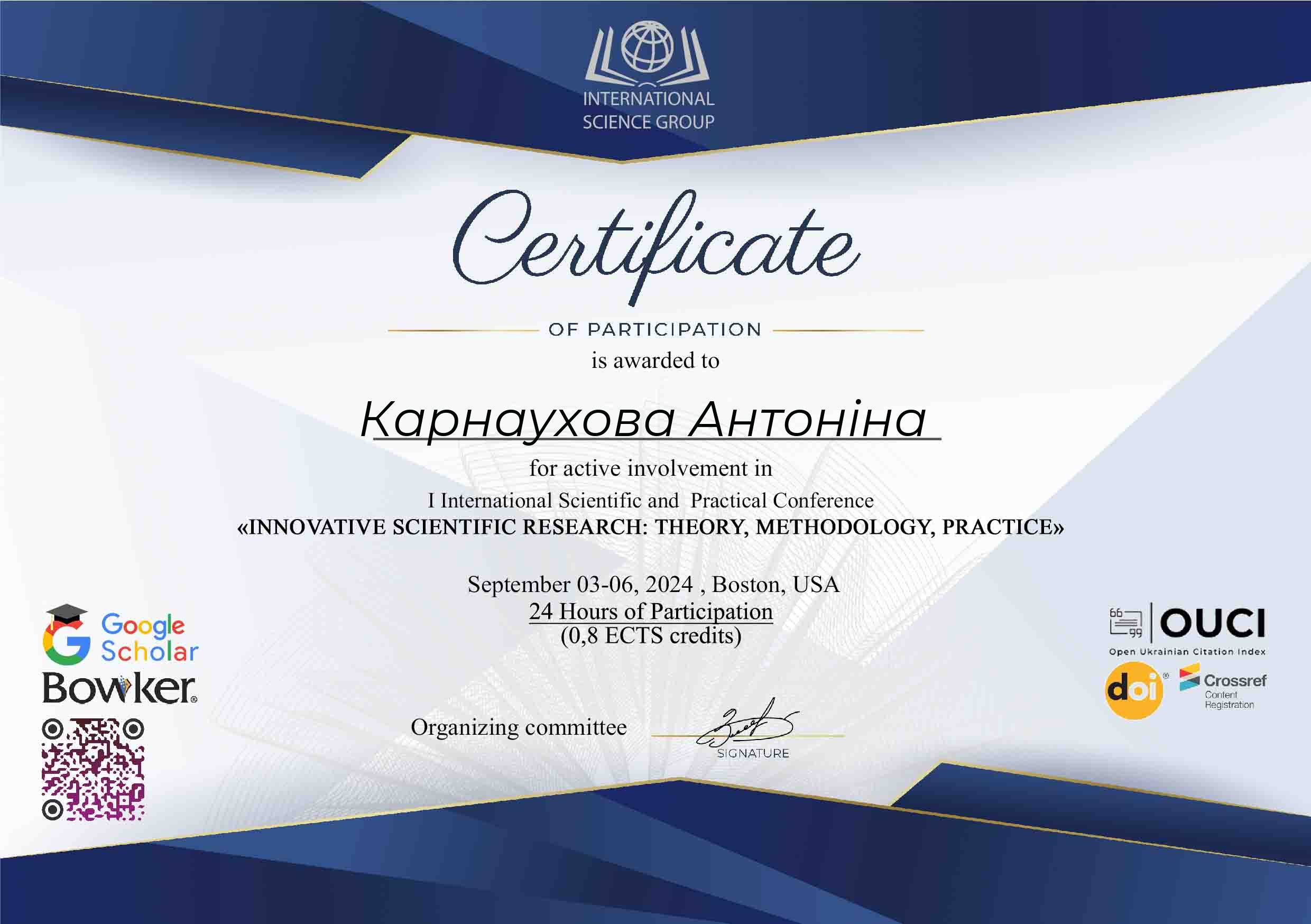 | ID | Назва | Тема доповіді | Місце проведення | Документ, що засвідчує | Дата проведення |