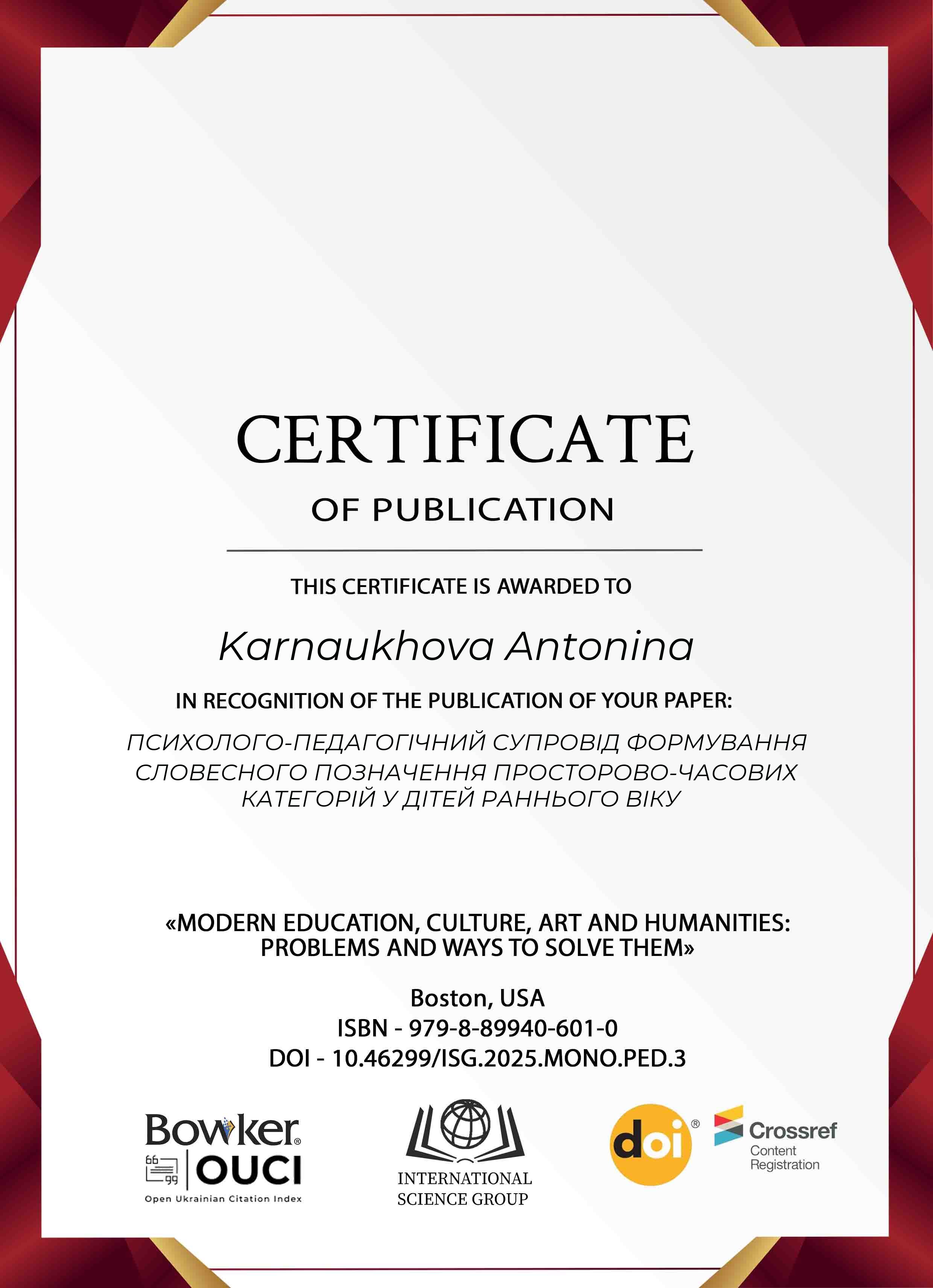 | 12943 | Modern education, culture, art and humanities: problems and ways to solve them | Психолого-педагогічний супровід формування словесного позначення просторово-часових категорій у дітей раннього віку | Boston, USA |