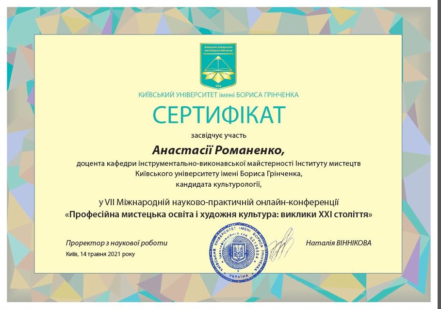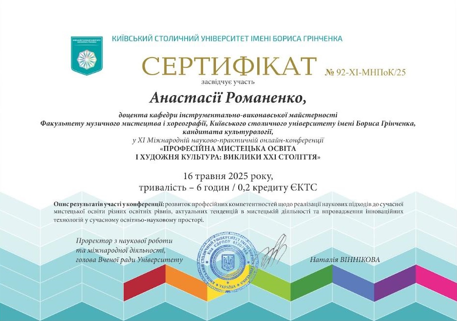 | 194 | Факультет музичного мистецтва і хореографії | Кафедра інструментально-виконавської майстерності | 2.7 | 1 | 2025 | https://www.researchgate.net/profile/Anastasiia_Romanenko |