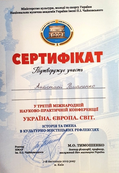 | 4449 | III Міжнародна науково-практична конференція "Україна. Європа. Світ. Історія та імена в культурно-мистецьких рефлексіях" | Полікультурна процесуальність життєтворчості Володимира Пухальського: мінський, варшавський, петербурзький, київський контексти | НМАУ ім. П.І. Чайковського |