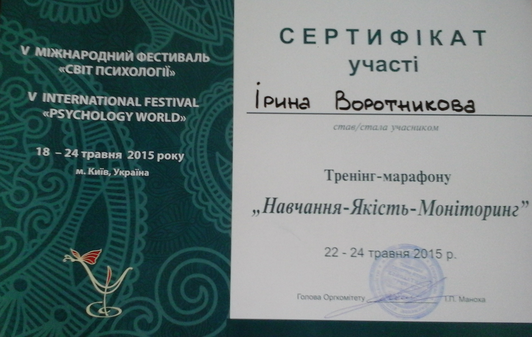 | 1088 | V Міжнародний фестиваль 'Світ психології' Тренінг Марафон 'Навчання | Участь у тренінгу | Київ |