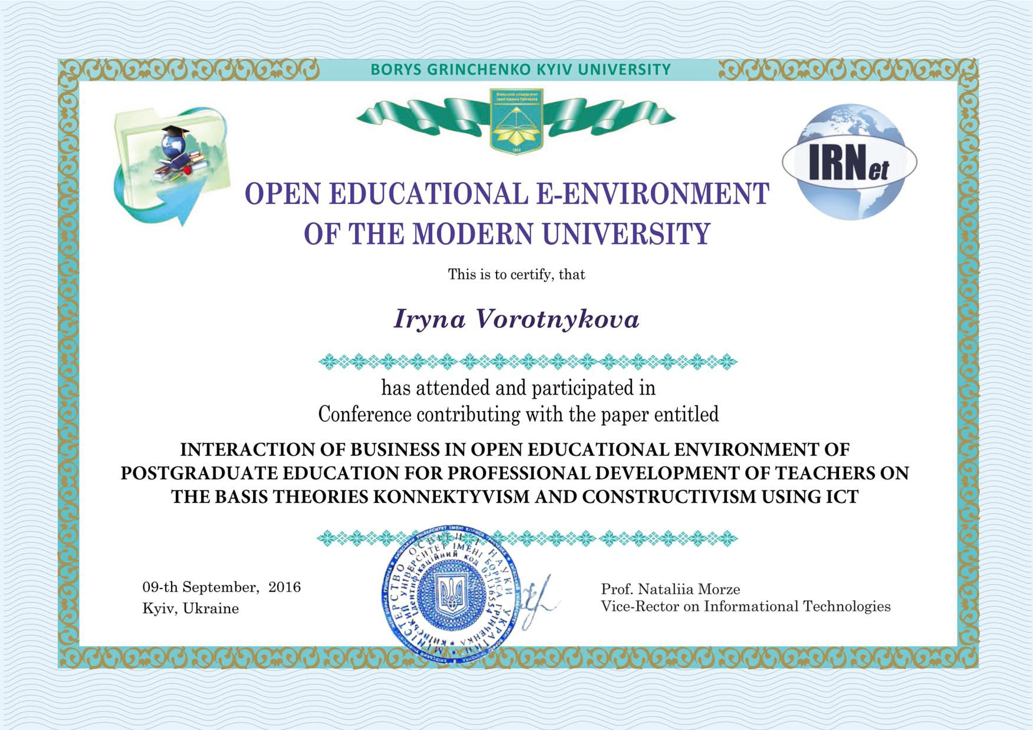 | 1226 | Міжнародна науково-практична конференція \ | Взаємодія суб'єктів у відкритому освітньому середовищі післядипломної педагогічної освіти для професійного розвитку вчителів на основі теорій коннективізму та конструктивізму з використанням ІКТ | Київ |