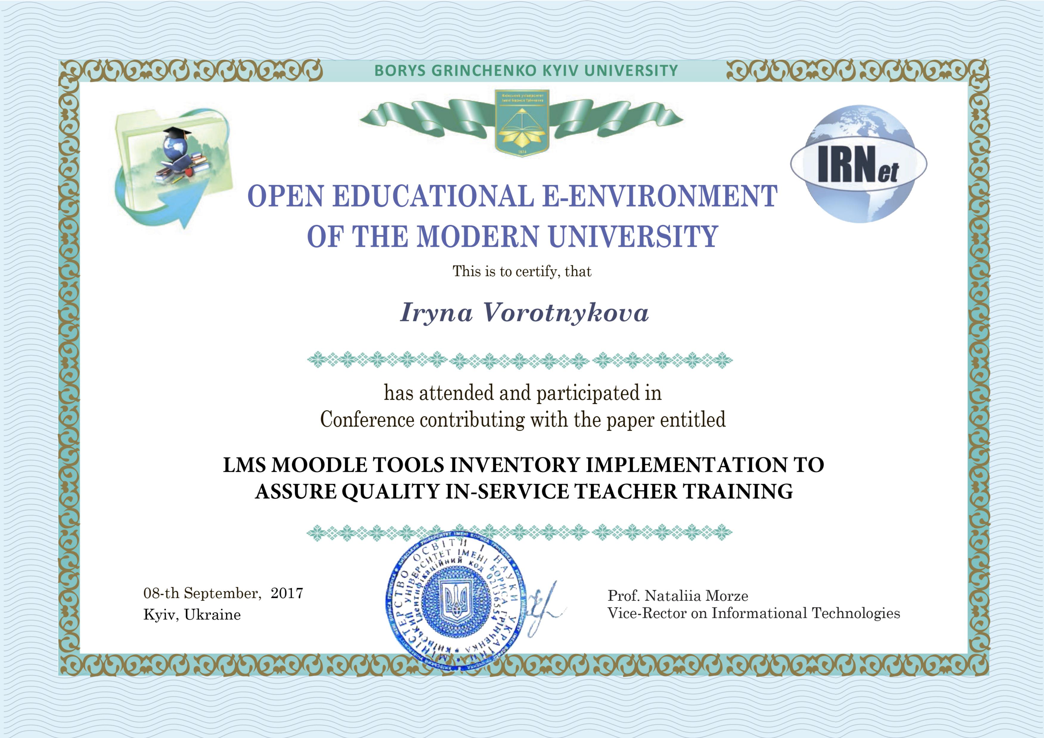 | 1792 | Open Educational e-Enviroment of the modern university | LMS Moodle tools inventory implementation to assure quality in service teacher trening | Kyiv |