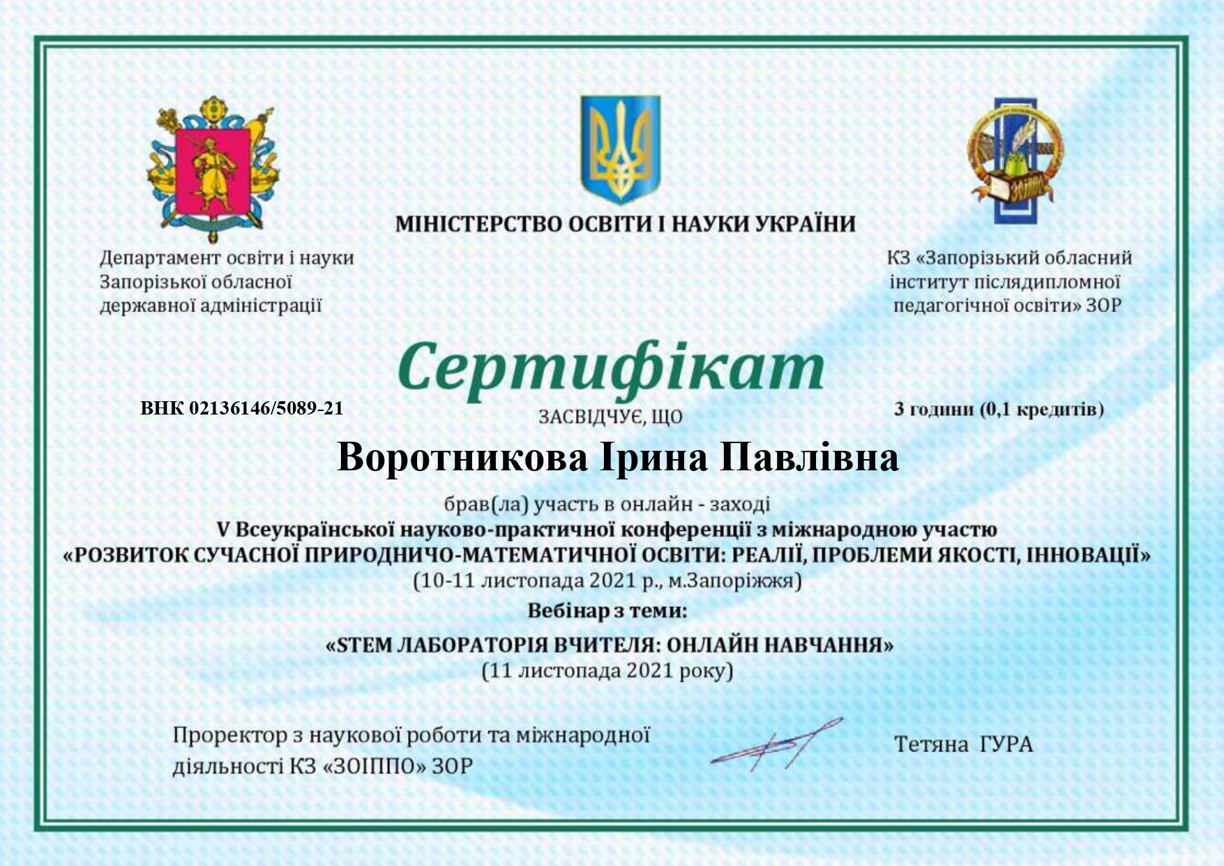 | 7663 | V Всеукраїнської науково-практичної конференції з міжнародною участю «РОЗВИТОК СУЧАСНОЇ ПРИРОДНИЧО-МАТЕМАТИЧНОЇ ОСВІТИ: РЕАЛІЇ, ПРОБЛЕМИ ЯКОСТІ, ІННОВАЦІЇ» | Вебінар «STEM лабораторія вчителя: онлайн навчання» | онлайн |