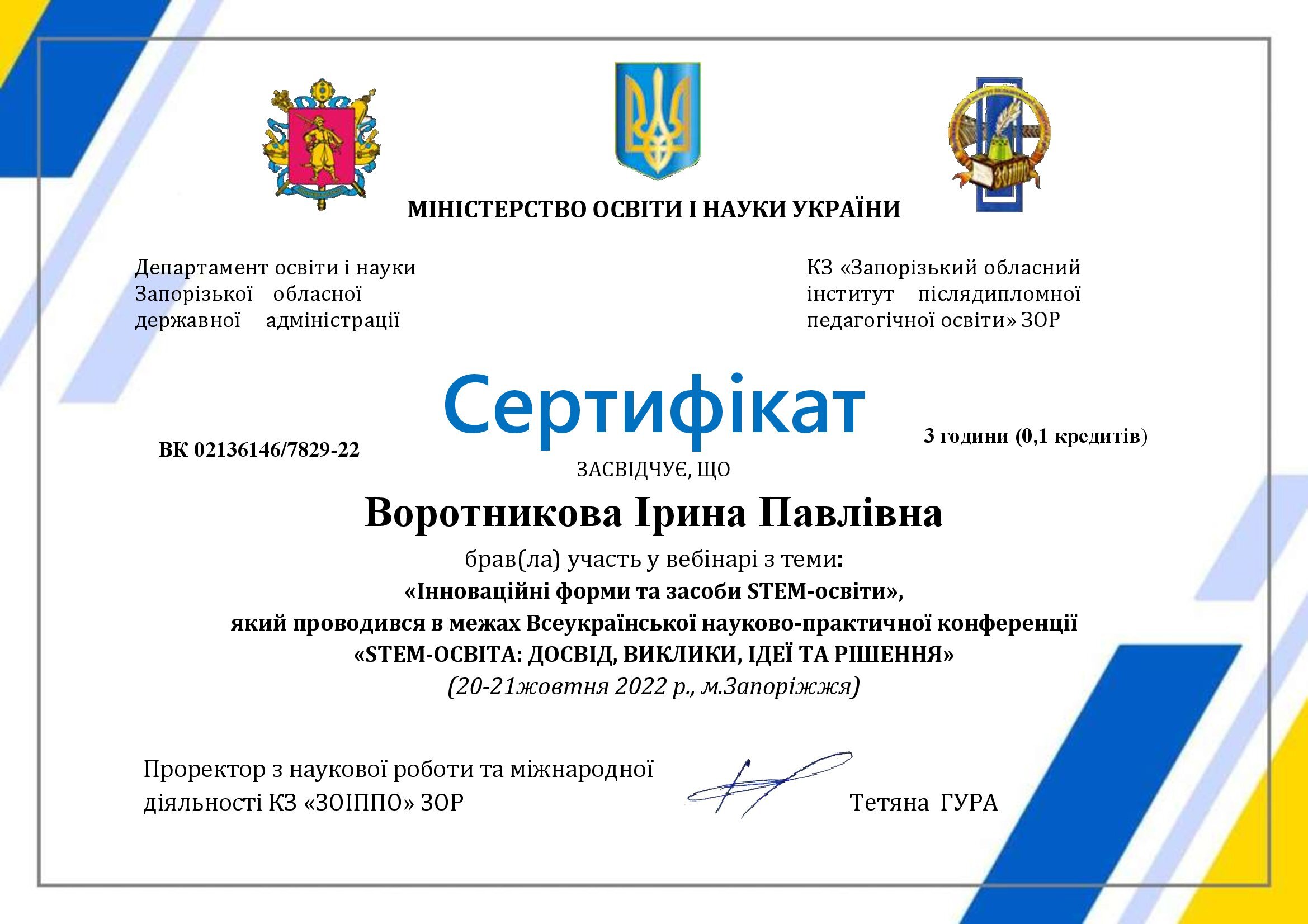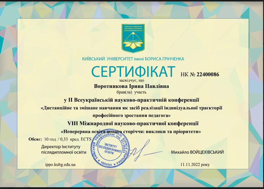 | 830 | Інститут післядипломної освіти | Кафедра природничо-математичної освіти та технологій | 239.4 | 4 | 2022 | https://www.researchgate.net/profile/Iryna-Vorotnykova |