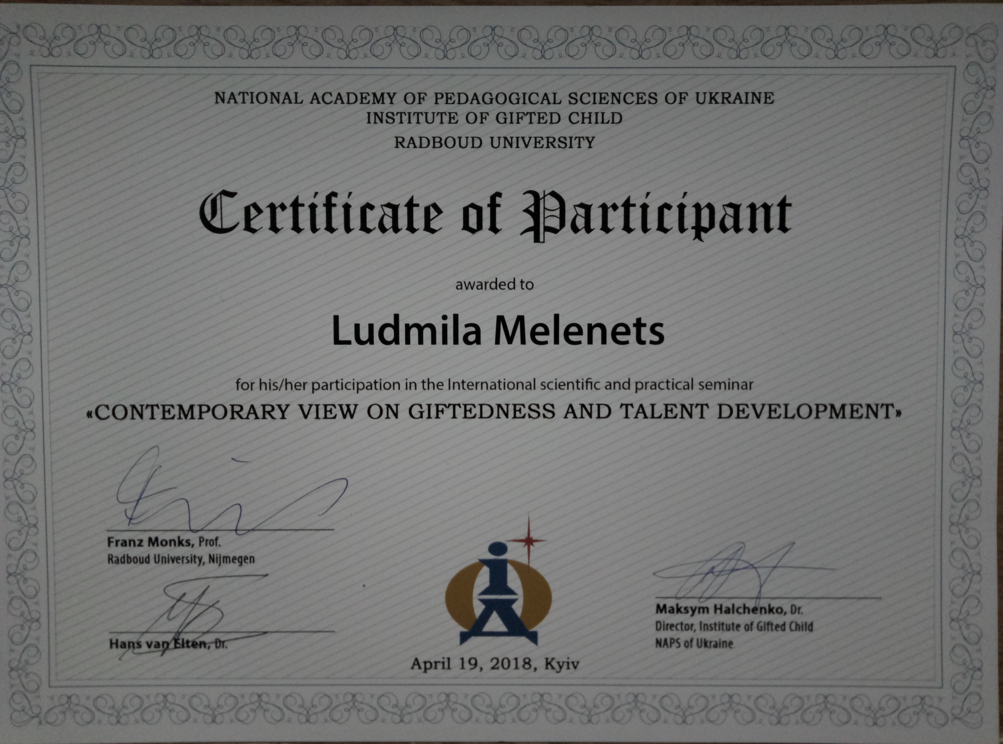 - Член організаційного комітету проведення міської науково-практичної конференції "Нова українська школа - новий дитячий садок" (Наказ ДОН від 18.09.2018 № 627)
