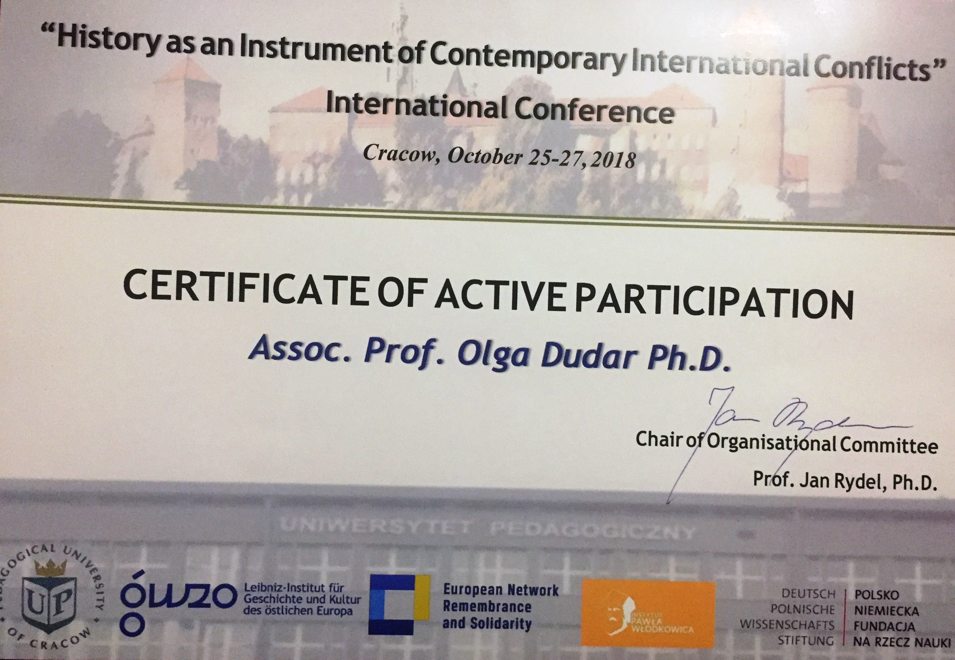| 3341 | International Conference “History as an Instrument of International Conflicts” | Heritage burnt, heritage born – paradox of “Space of Memory” in conflicts. Ukrainian experience reconsidered. | Pedagogical University of Cracow, Department of Political Science, Institute of Political |