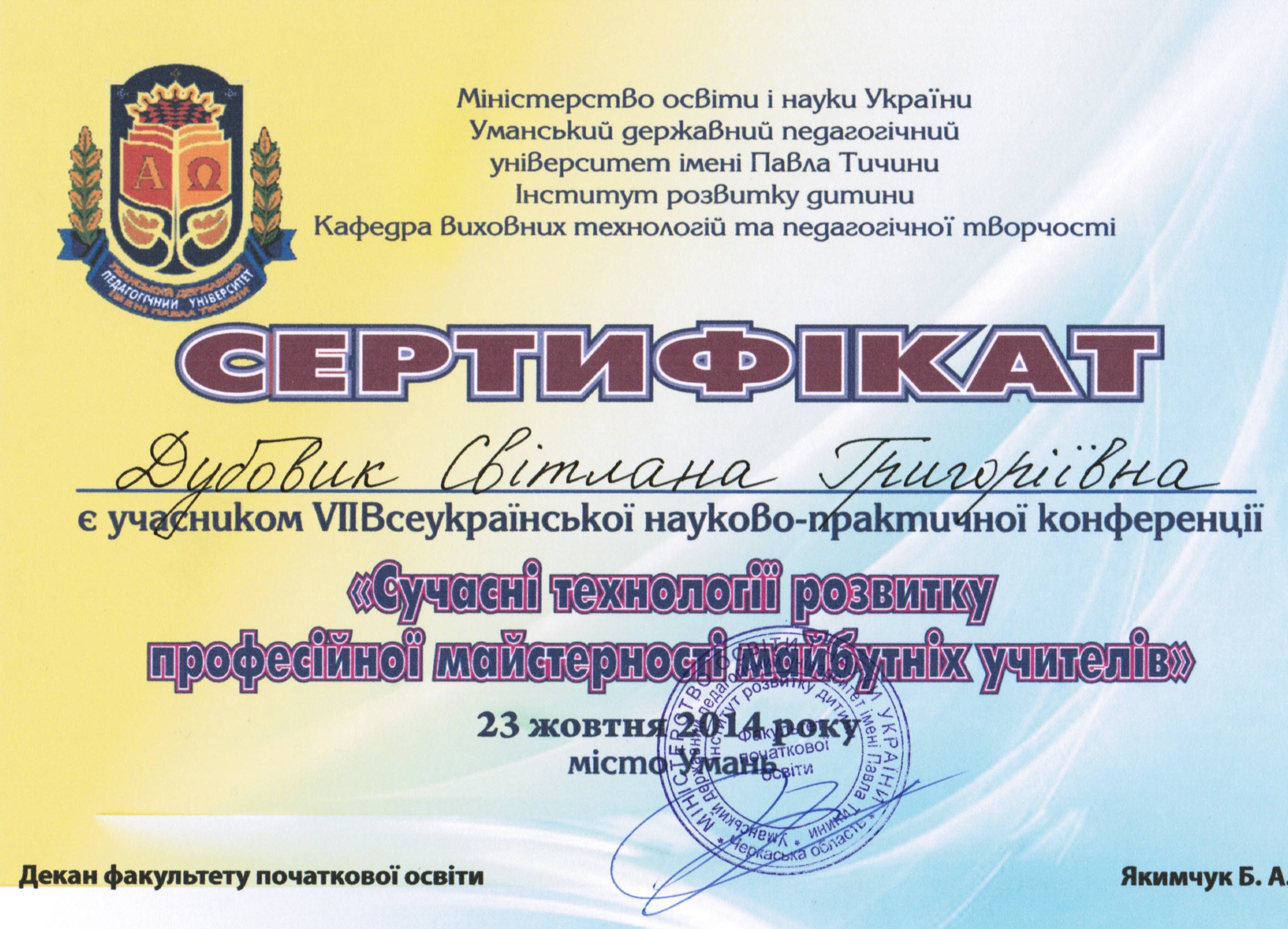 | 995 | «Сучасні технології розвитку професійної майстерності майбутніх учителів» | Формування культури професійного мовлення майбутніх учителів початкової школи | м. Умань, Уманський державний педагогічний університет імені Павла Тичини |