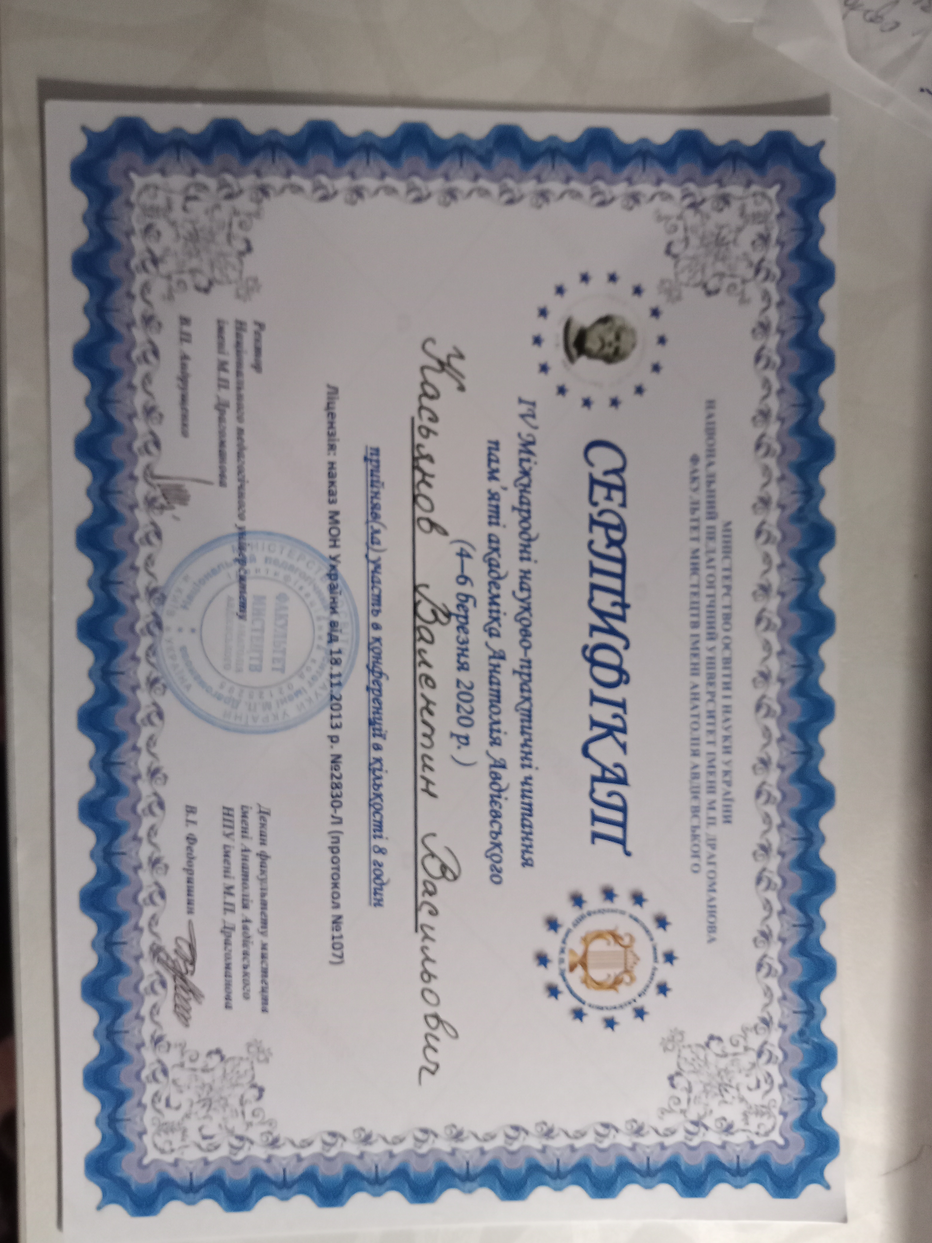 | 6095 | IV Міжнародні науково-практичні читання пам'яті академіка Анатолія Авдієвського | Творчий конструкт підготовки магістрів музичного мистецтва до керівництва художнім колективом | НПУ імені М.П.Драгоманова |
