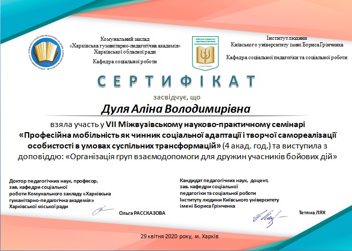 | 5321 | Професійна мобільність як чинник соціальної адаптації і творчої самоорганізації особистості в умовах суспільних трансформацій | Організація груп взаємодопомоги для дружин учасників бойових дій | м. Харків |