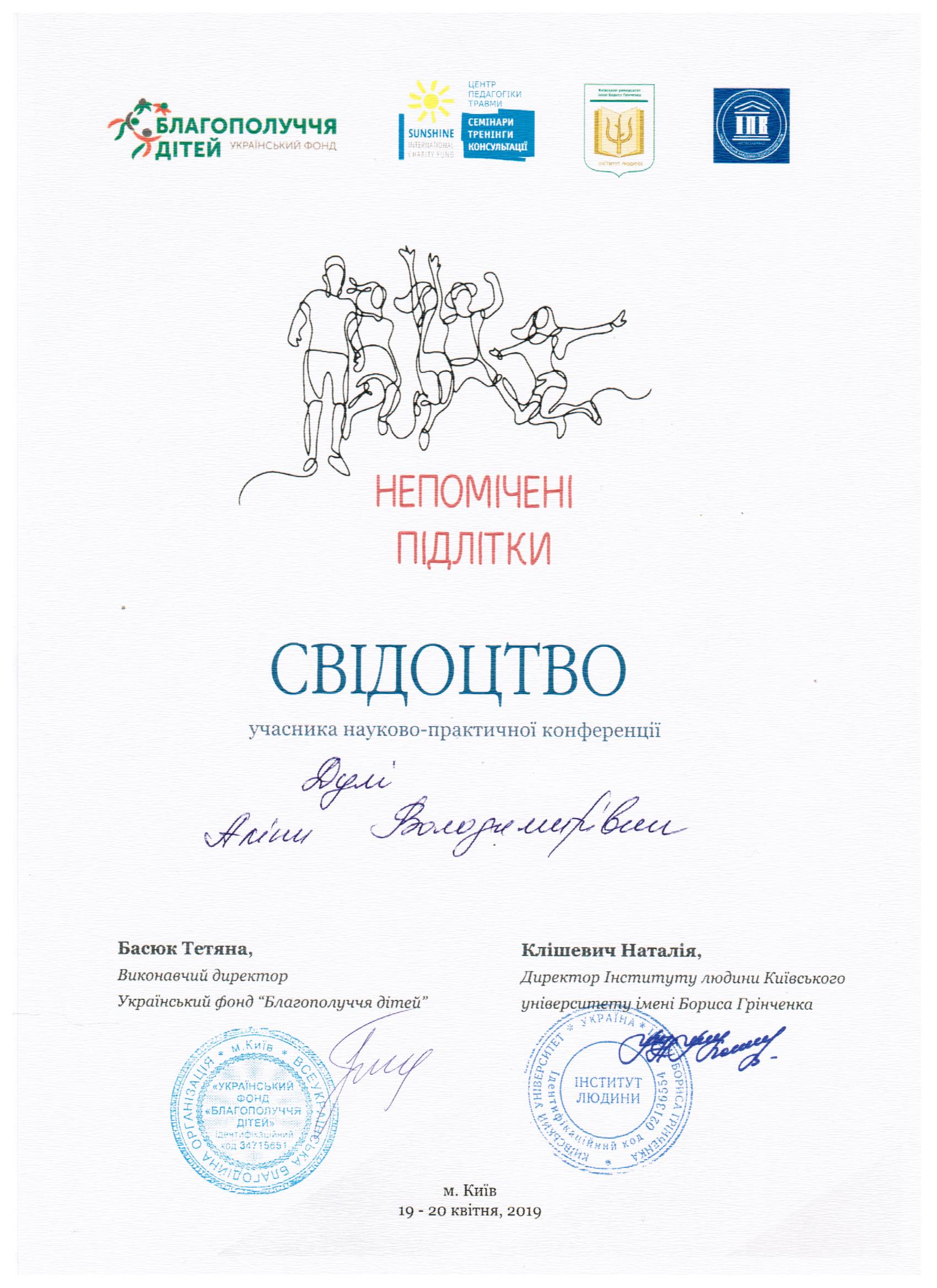 | 10304 | ВСЕУКРАЇНСЬКОЇ НАУКОВО-ПРАКТИЧНОЇ ІНТЕРНЕТ КОНФЕРЕНЦІЇ «Актуальні проблеми соціальної роботи: досвід і перспективи» | Діти учасників бойових дій як об’єкт соціально-педагогічної роботи | Кам’янець-Подільський | document.pdf | |