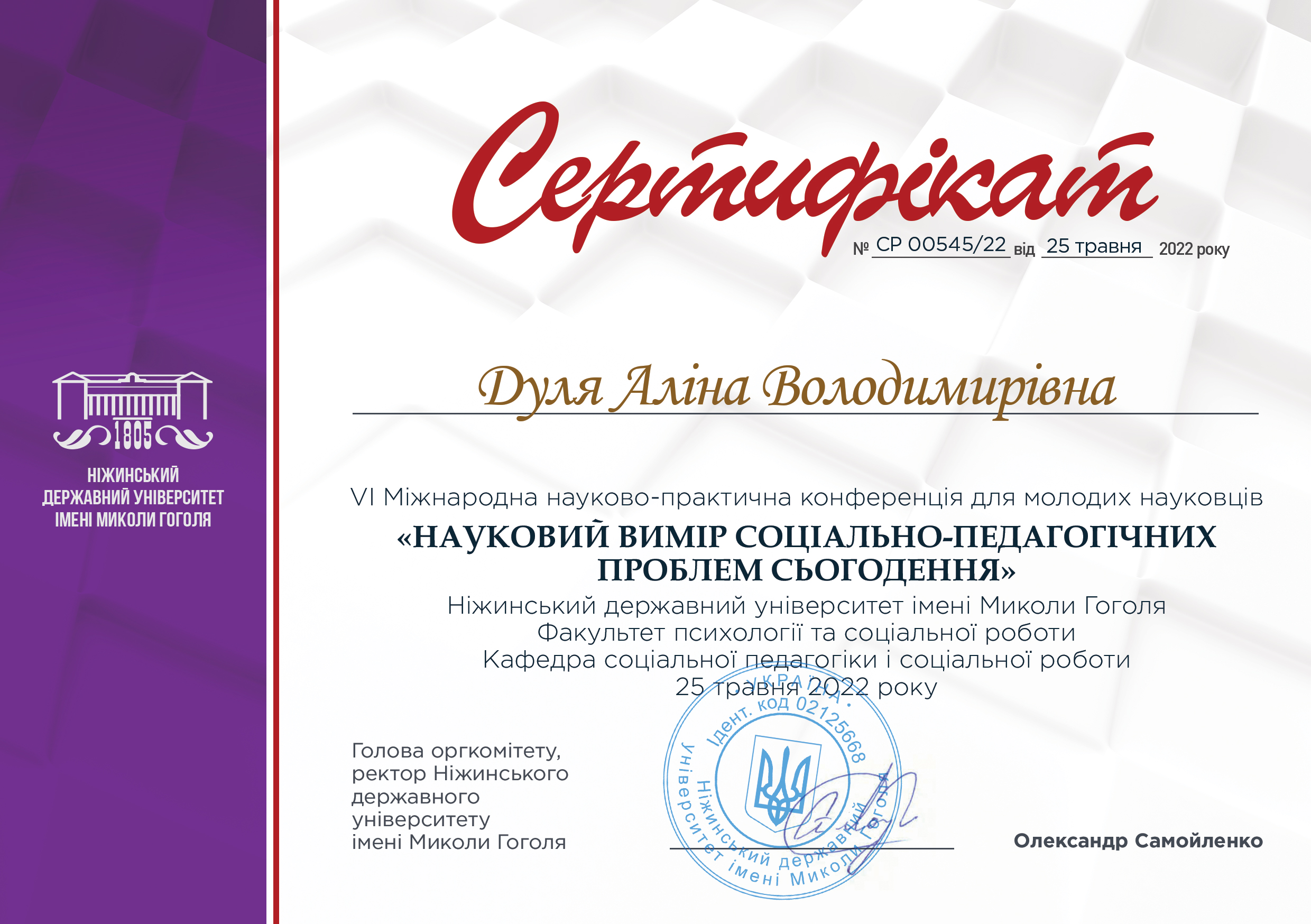 | 95 | Факультет психології, соціальної роботи та спеціальної освіти | Кафедра соціальної педагогіки та соціальної роботи | 131.4 | 3 | 2025 | https://www.researchgate.net/profile/Alina_Dulia |
