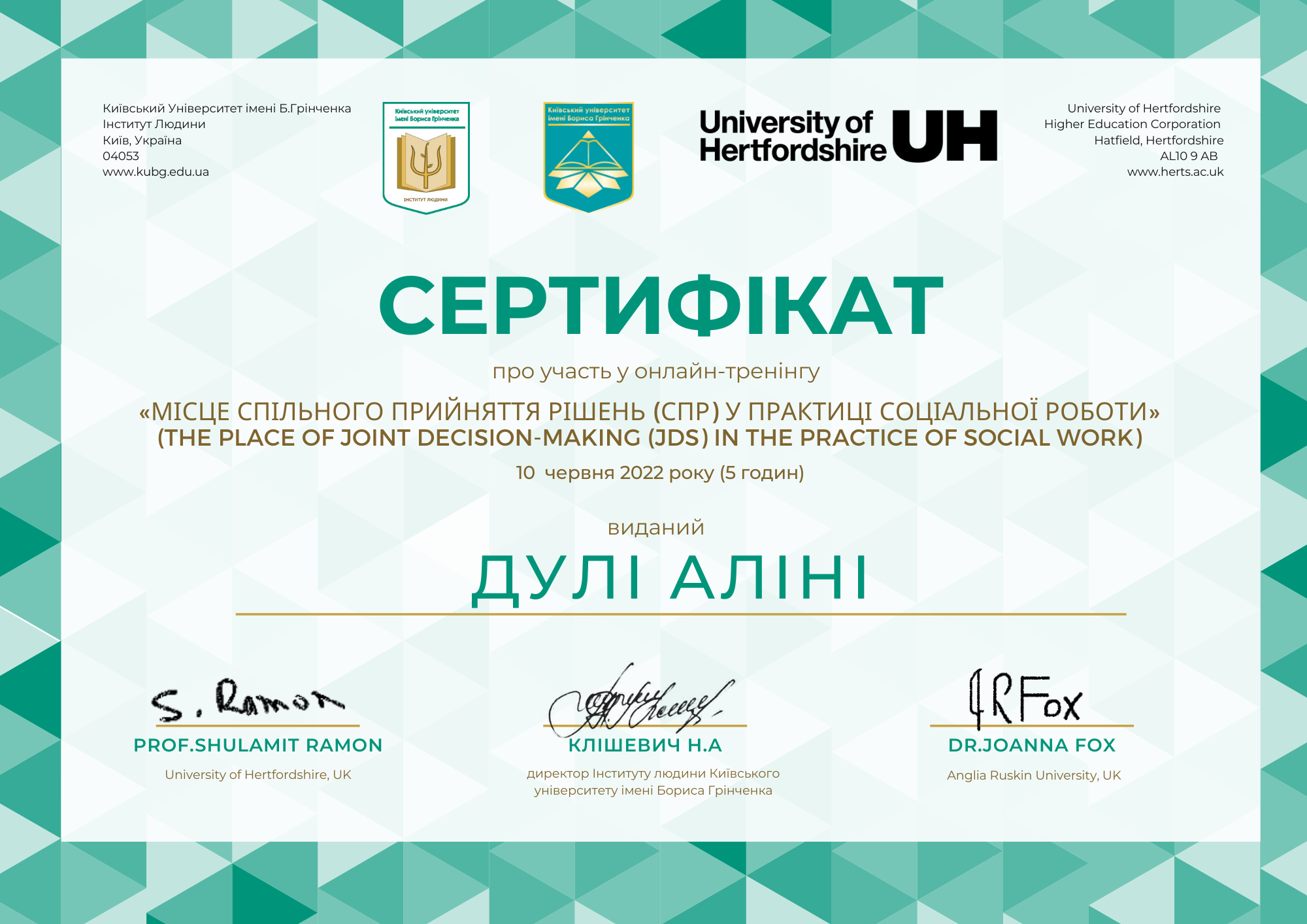 | 8455 | Місце спільного прийняття рішень (СПР) у практиці соціальної роботи | Учасник тренінгу | Онлайн (за Київським часом) |