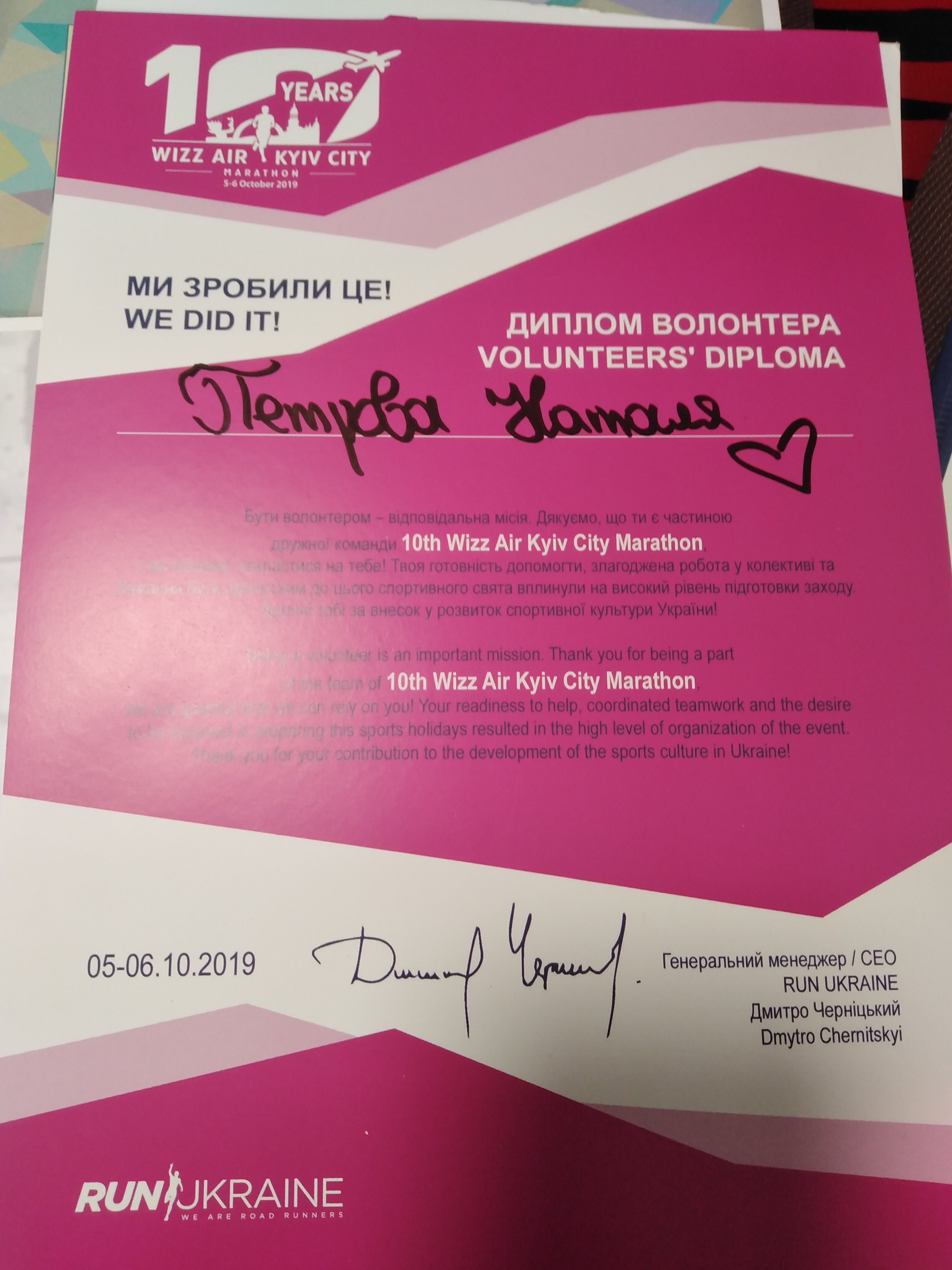 | 5358 | Диплом волонтера | Змагання з легкоатлетичного бігу | Софіївська площа |