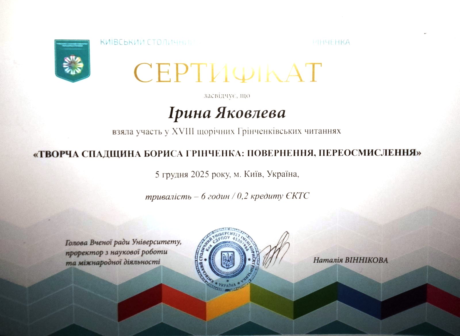 | 12868 | Всеукраїнський круглий стіл «Творча спадщина Бориса Грінченка: повернення, переосмислення» | Грінченкознавець: пам’яті Василя Яременка | Київ |