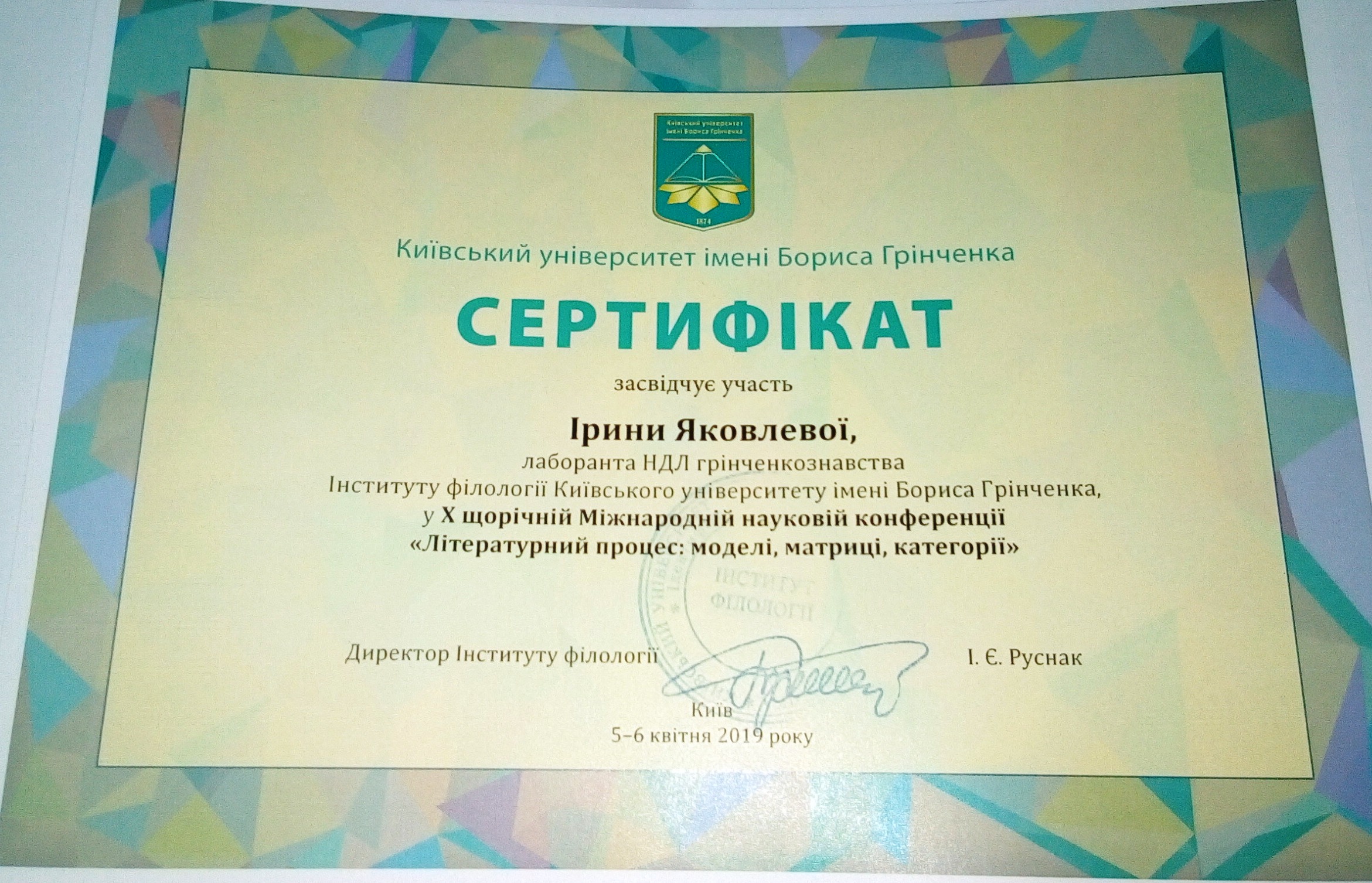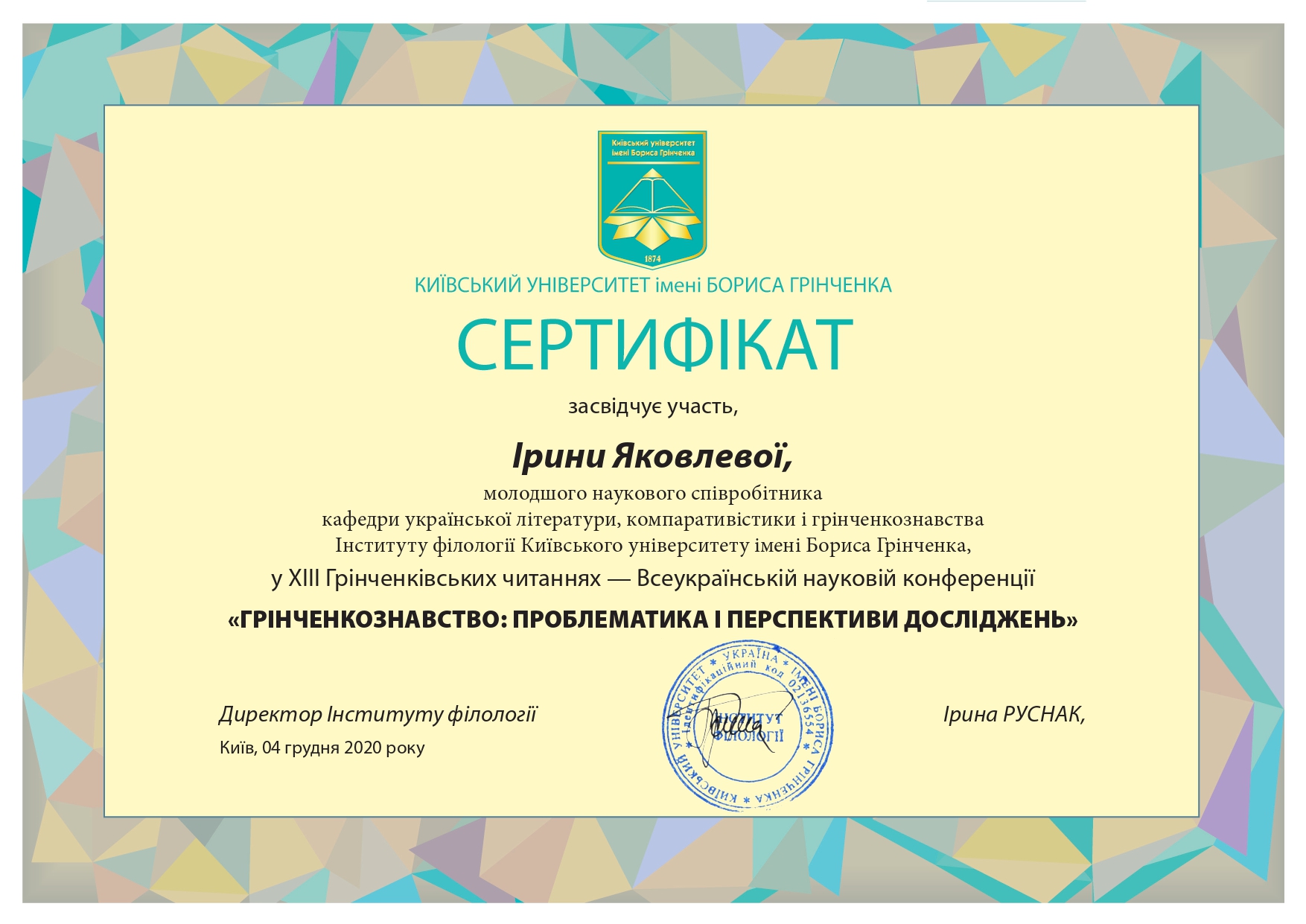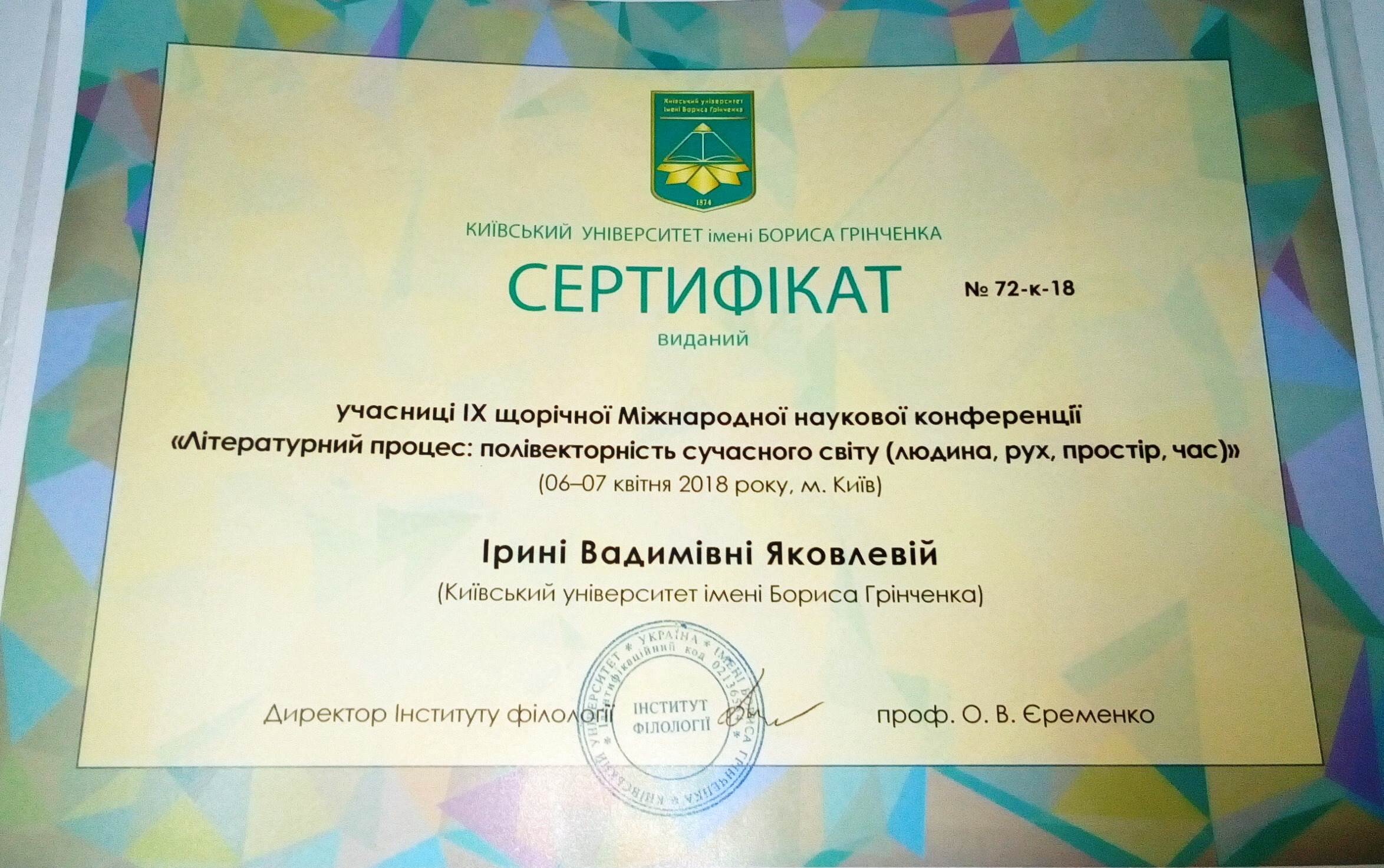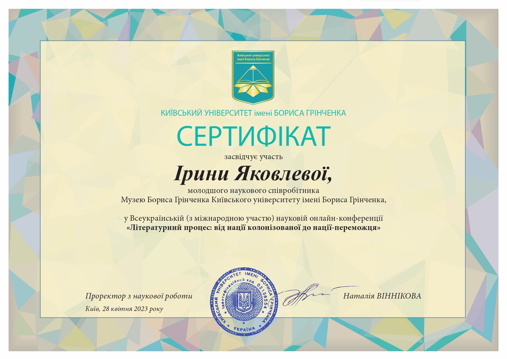 | 7496 | Всеукраїнська (з міжнародною участю) наукова онлайн-конференція «Літературний процес: | У науковому просторі Бориса Грінченка (до виходу монографії Василя Яременка «Наукова і епістолярна спадщина Бориса Грінченка») | Київ | document.pdf | |