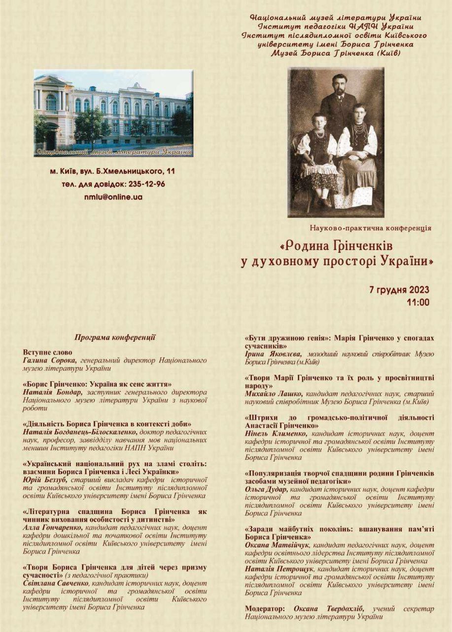 | 9954 | Науково-практична конференція "Родина Грінченків у духовному просторі України" | Бути дружиною генія: Марія Грінченко у спогадах сучаснків | Київ |