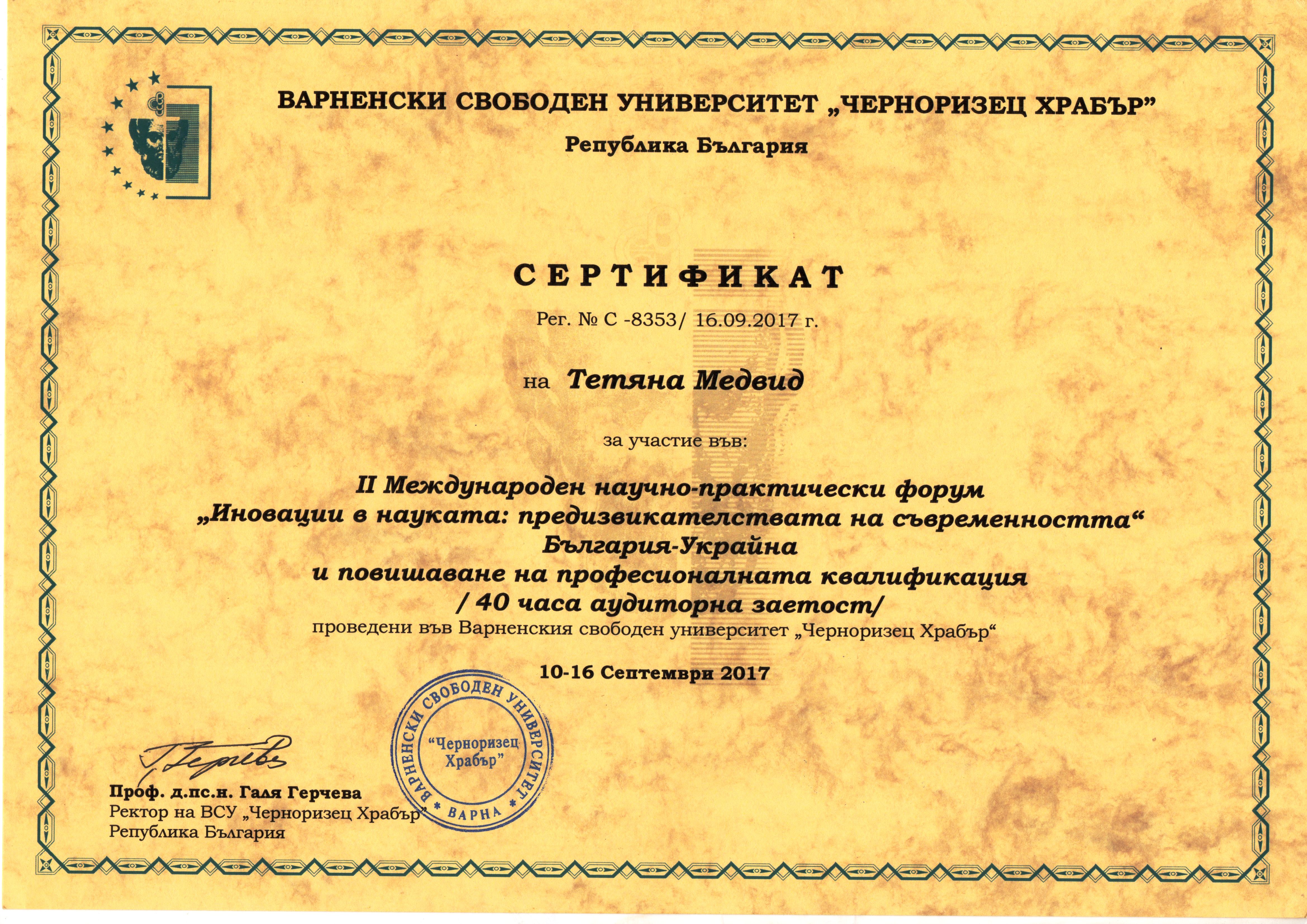| 56 | Вільний університет Варни (Болгарія) | Наукове стажування | 10-16.09.2017 | Дистанційна | Університет Варни |