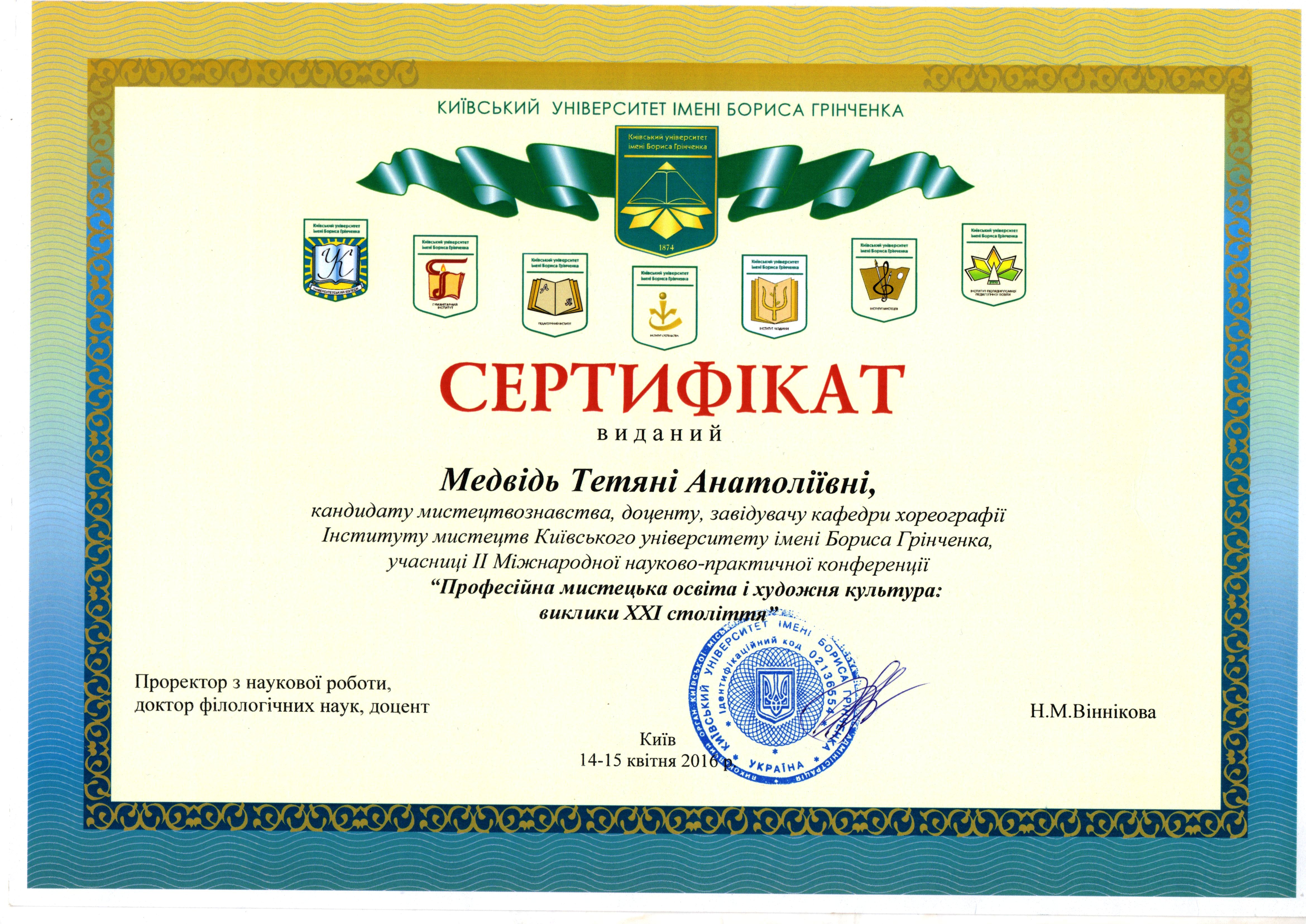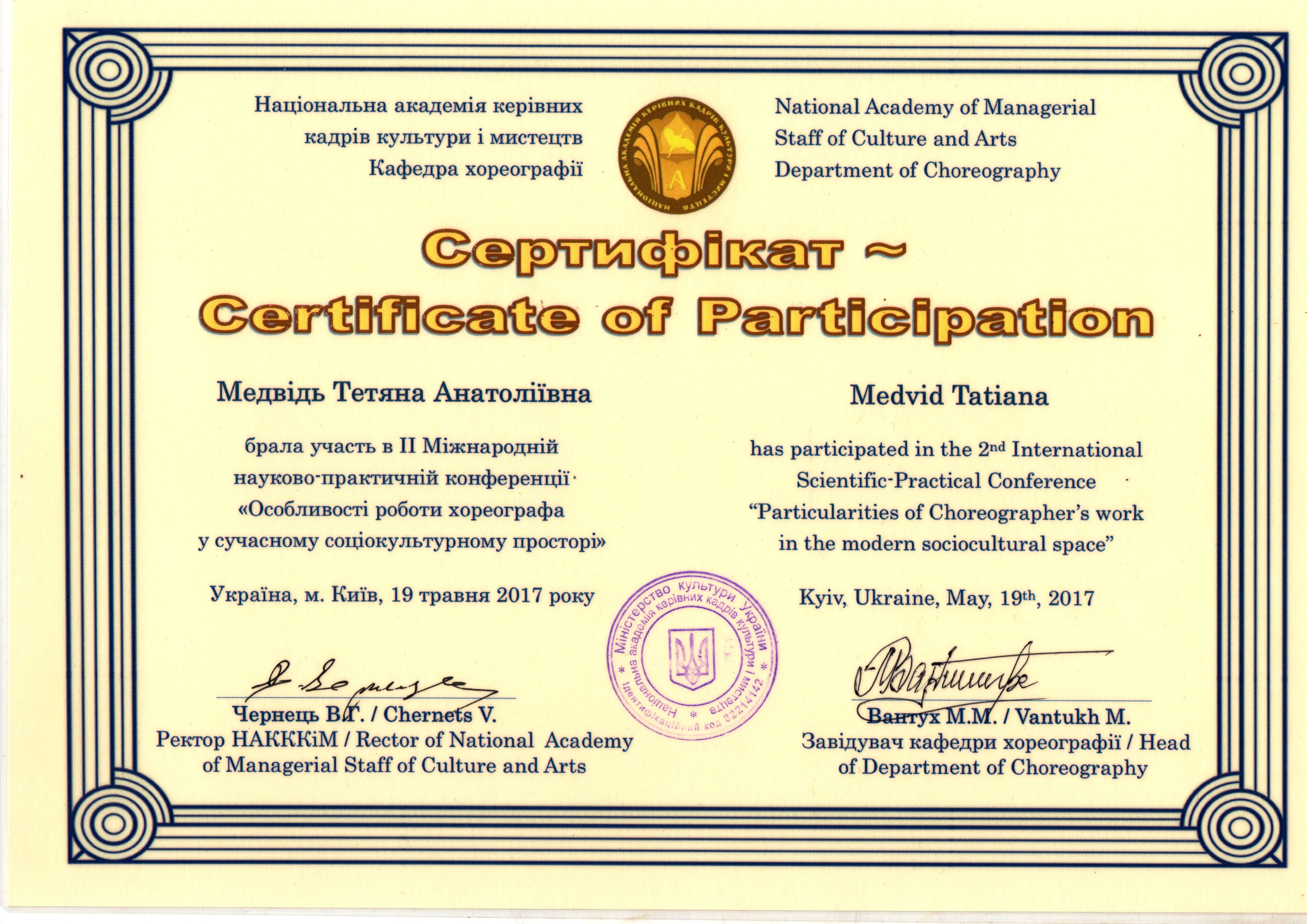 | 1804 | ІІ Міжнародна науково-практична конференція "Особливості роботи хореографа в сучасному соціокультурному просторі" | Переосмислення літературних образів балетмейстерами сучасності | Київ-Мінськ |