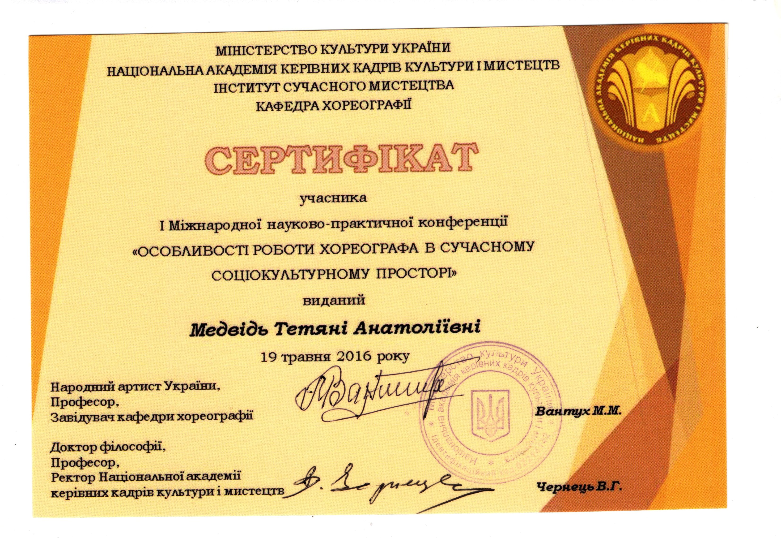 | 1805 | І Міжнародна науково-практична конференція "Особливості роботи хореографа в сучасному соціокультурному просторі" | Танець буто в контексті сучасної хореографічної культури | Київ |
