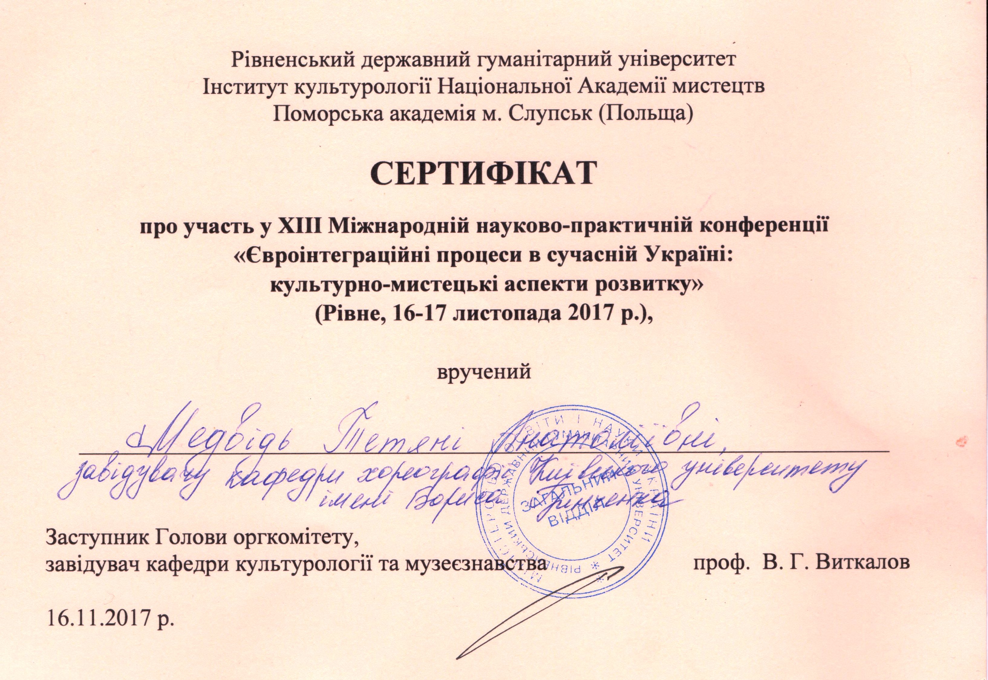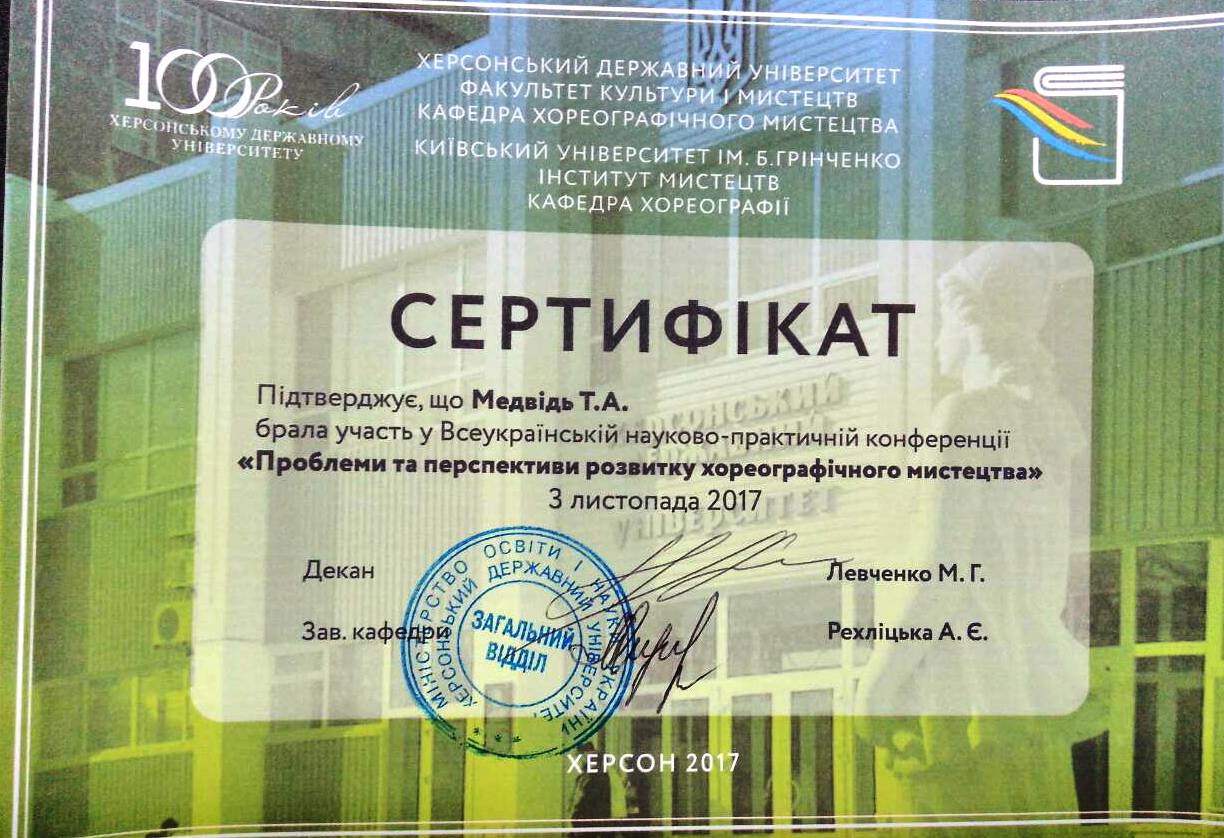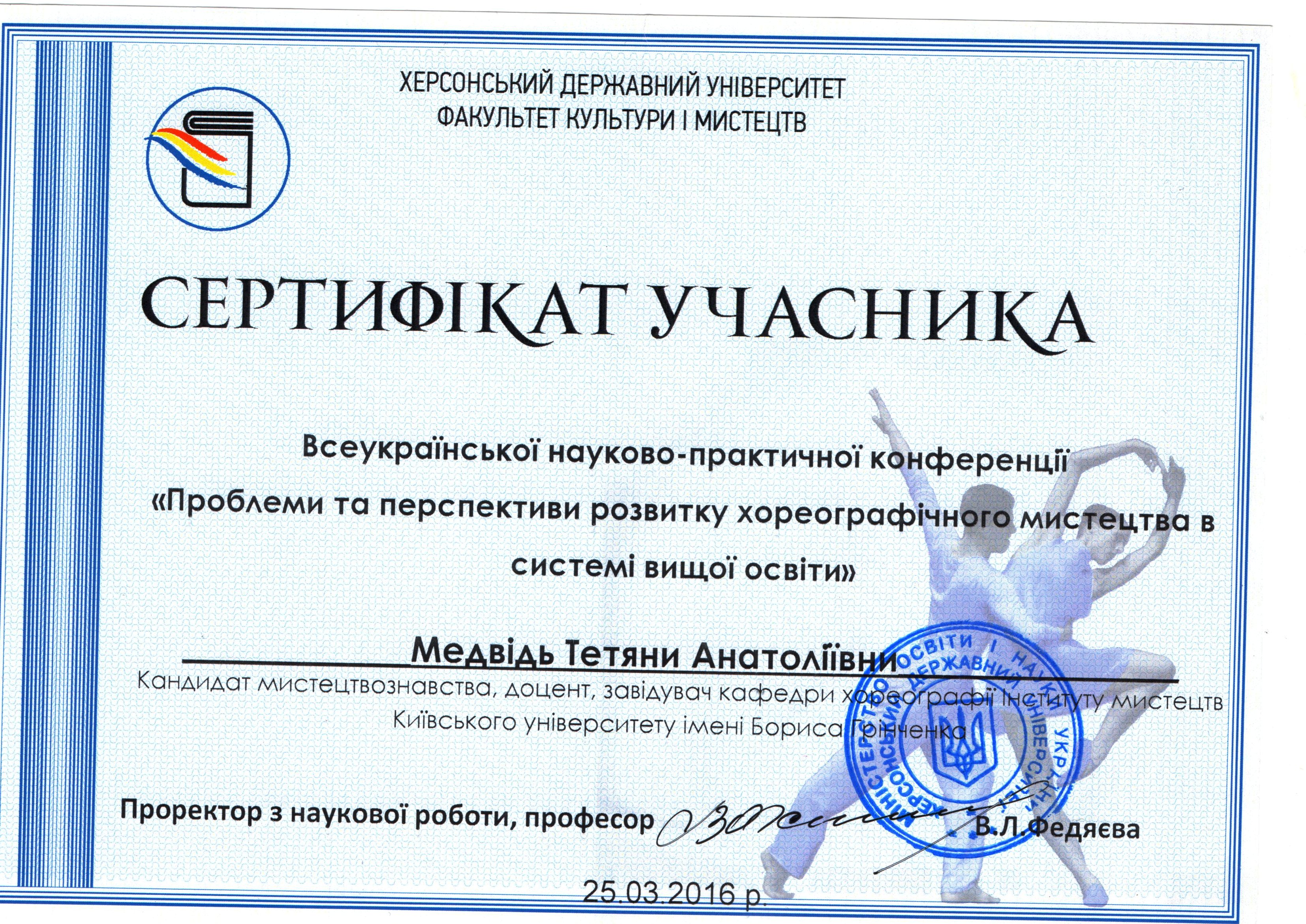 | 1806 | Всеукраїнська науково-практична конференція "Проблемита перспективи розвитку хореографічного мистецтва в системі вищої освіти" | Проблеми реалізації компетентнісного підходу в процесі підготовки майбутніх хореографів в навчальних закладах | Херсон |